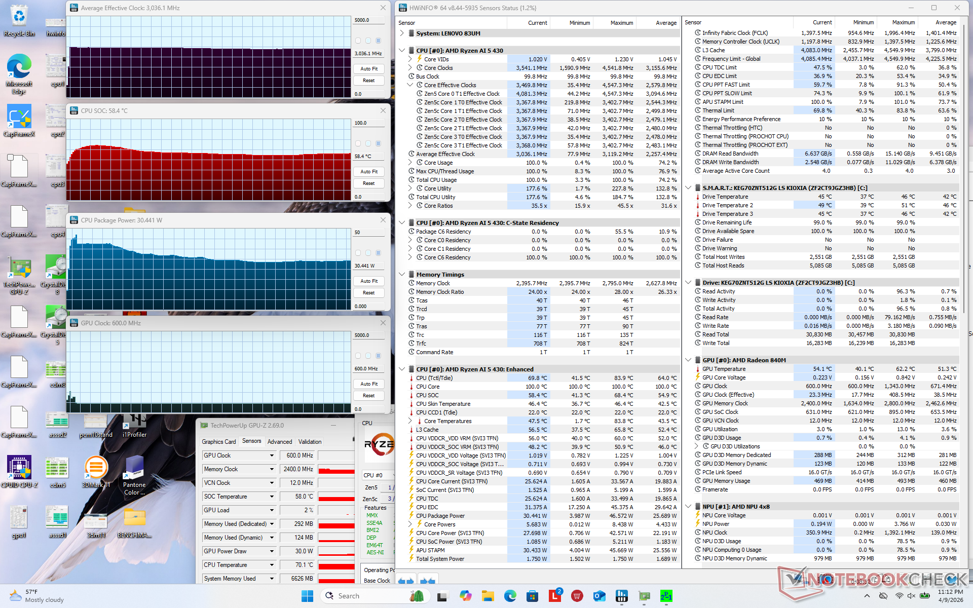 Der Prozessor stabilisiert sich bei 3 GHz, 30 W und 58 °C, wenn Prime95 Stress läuft. Die Leistung des CPU-Pakets kann nur zu Beginn des Tests bis zu 47 W erreichen, wie die Screenshots unten zeigen. Die Kerntemperaturen unter hohen Lasten liegen knapp 10 bis 15 °C niedriger als bei dem Intel‑basierten IdeaPad Slim 3 15IRH10R, das wir zuvor getestet haben.