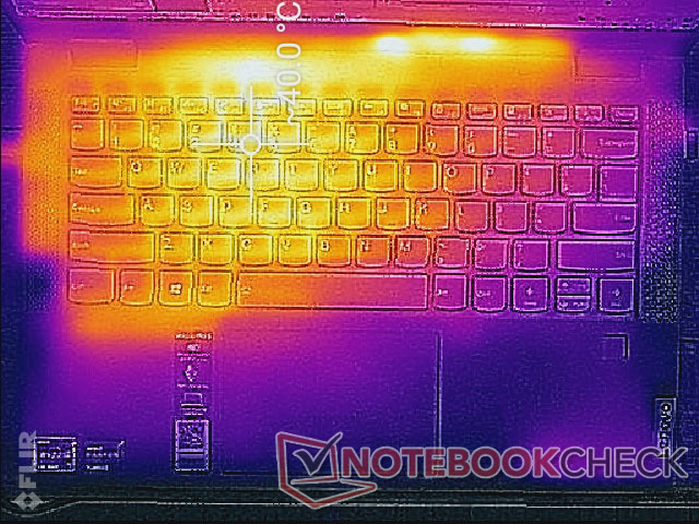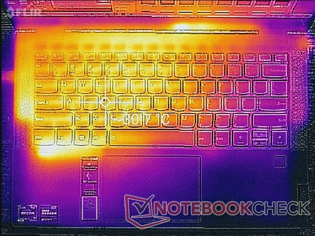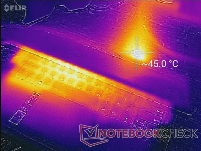 Die Temperaturverteilung ist suboptimal, da die linke Laptophälfte immer heißer wird als die rechte. Unter hohen Lasten erwärmt sich die linke Hälfte auf rund 45 °C, während die rechte Hälfte nur 28 °C erreicht. Das führt zu einer unangenehmen, unausgeglichenen Erfahrung. Das rivalisierende Asus VivoBook 14 Flip leidet unter ähnlichen Problemen, hier sind nur die beiden Hälften vertauscht.