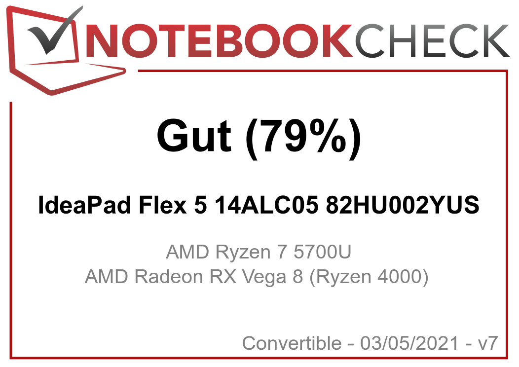 | 79.2 % v7 (old) | 05 / 2021 | Lenovo IdeaPad Flex 5 14ALC05 82HU002YUS R7 5700U, Vega 8 | 1.6 kg | 20.8 mm | 14.00" | 1920x1080 | |
