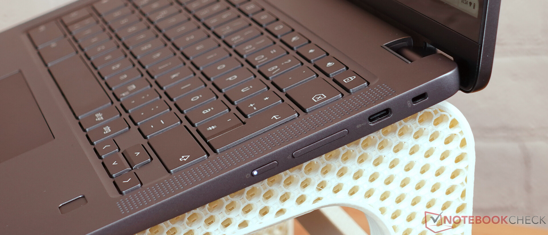 Auf beiden Seiten des Geräts befindet sich jeweils ein USB-C-Anschluss. Beide bieten DisplayPort und PowerDelivery für externe Bildschirme und für das Ladegerät. Auf der linken Seite finden sich zusätzlich ein USB-A-Anschluss, ein MicroSD-Kartenleser und ein kombinierter Audioanschluss für Kopfhörer und Mikrofon. Für die Sicherheit bietet das Chromebook einen Kensington Lock Slott und einen Fingerabdrucksensor.