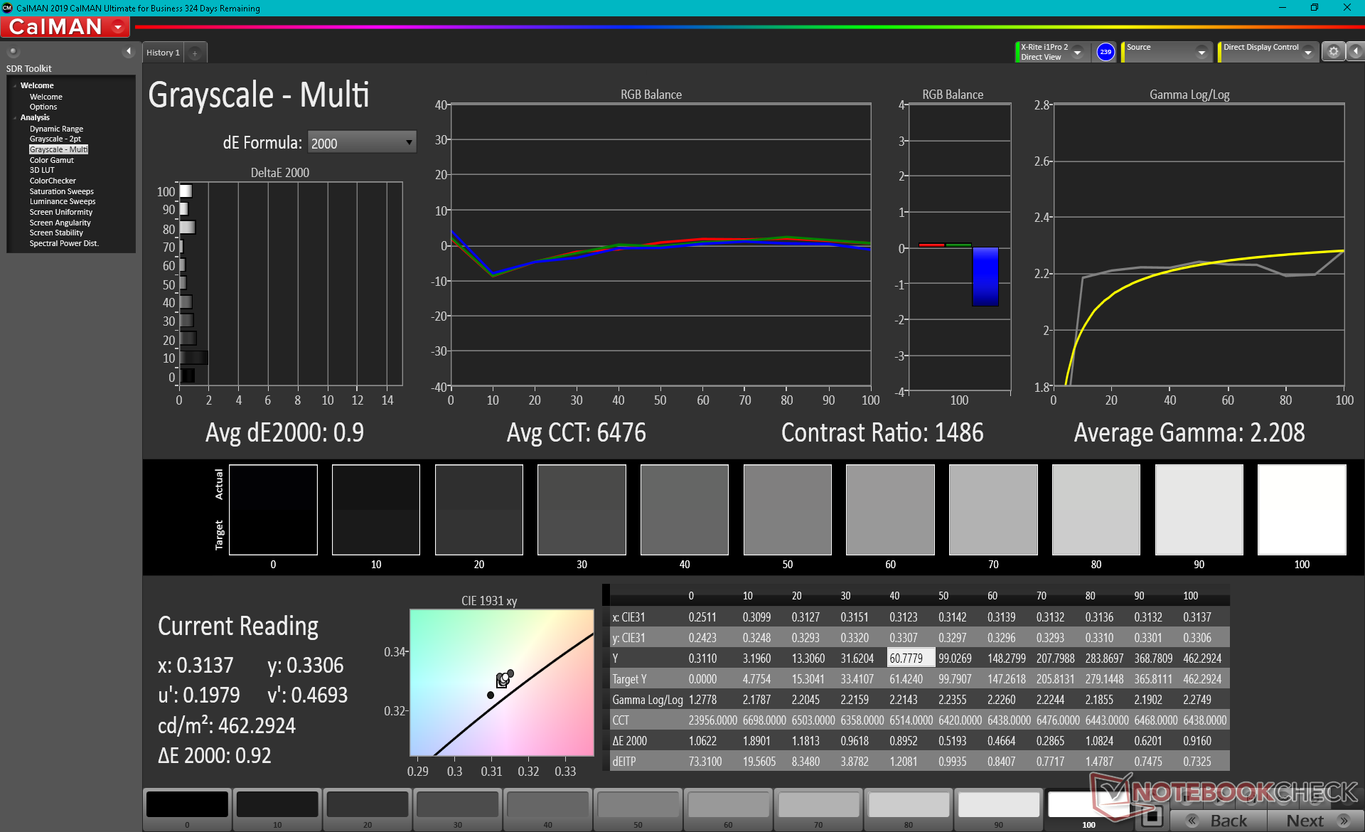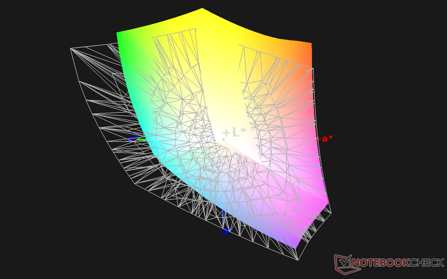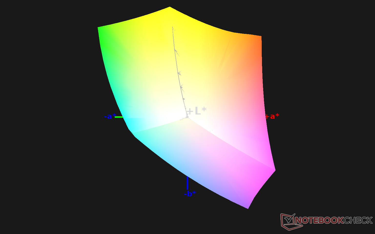 Das Display könnte im Lieferzustand besser kalibriert sein. Die durchschnittlichen Delta-E-Graustufen- und Farbwerte liegen bei 4,1 bzw. 3,81, was nicht schlecht ist. Angesichts des breiten Farbraums dieses Panels wäre aber sicherlich mehr möglich. Die Graustufenwerte würden sich durch eine Kalibrierung mit einem X-Rite-Farbspektrometer deutlich verbessern,