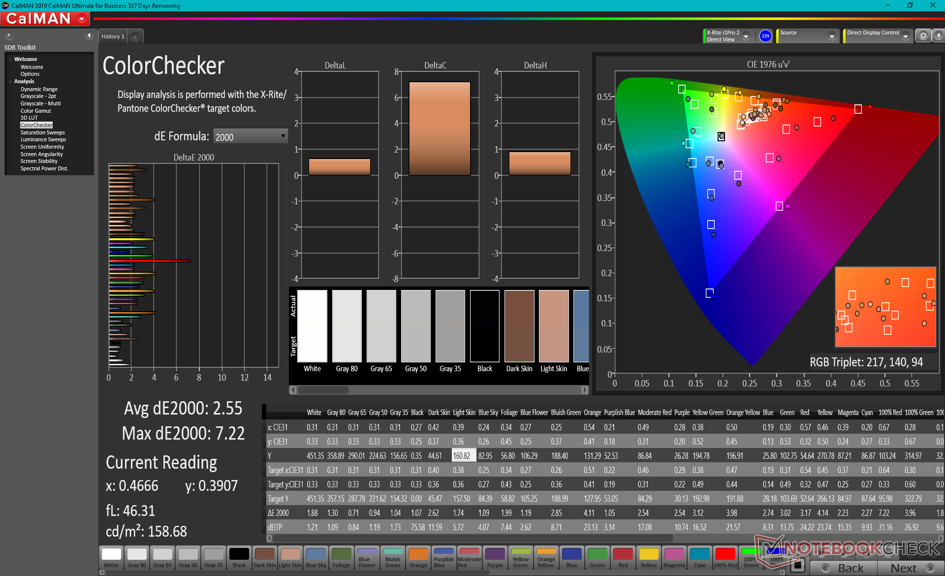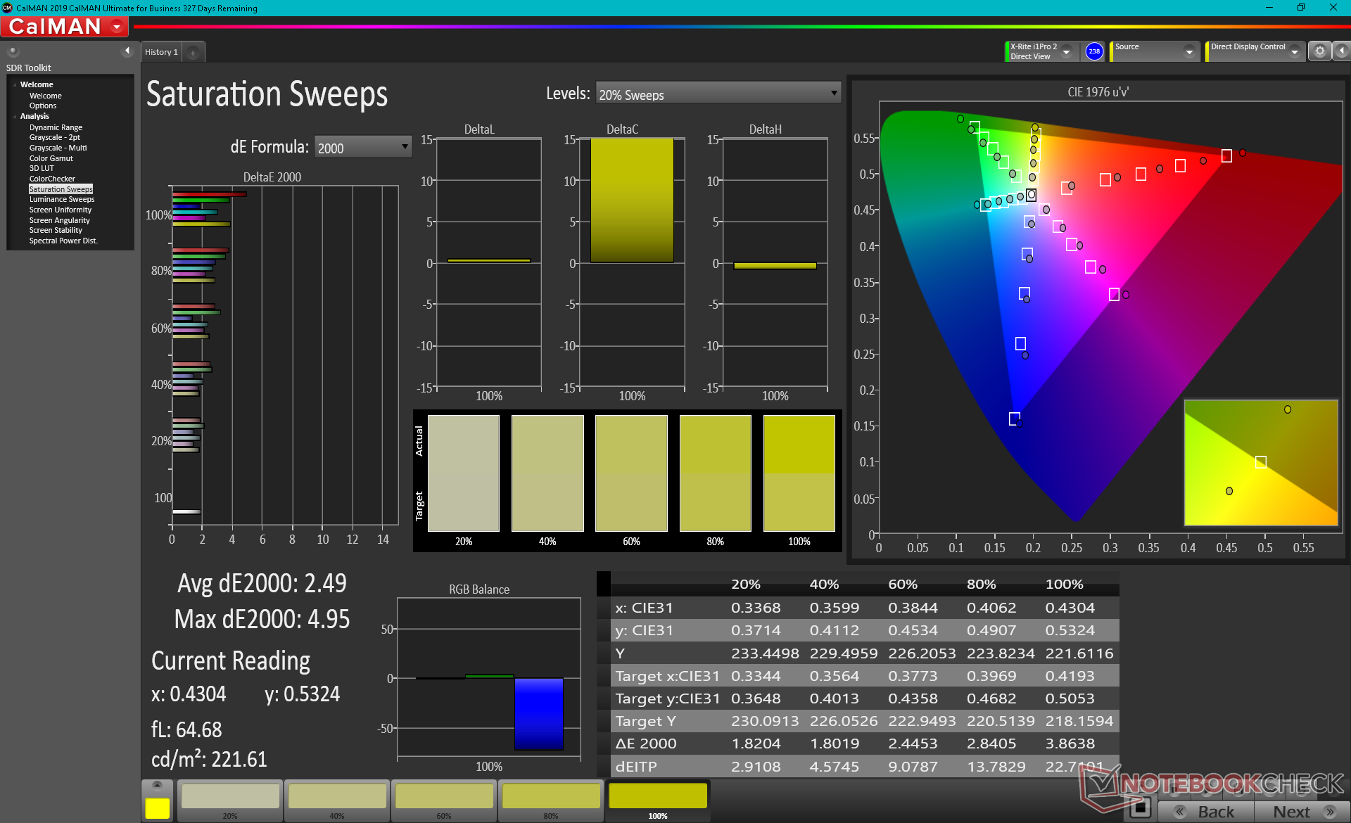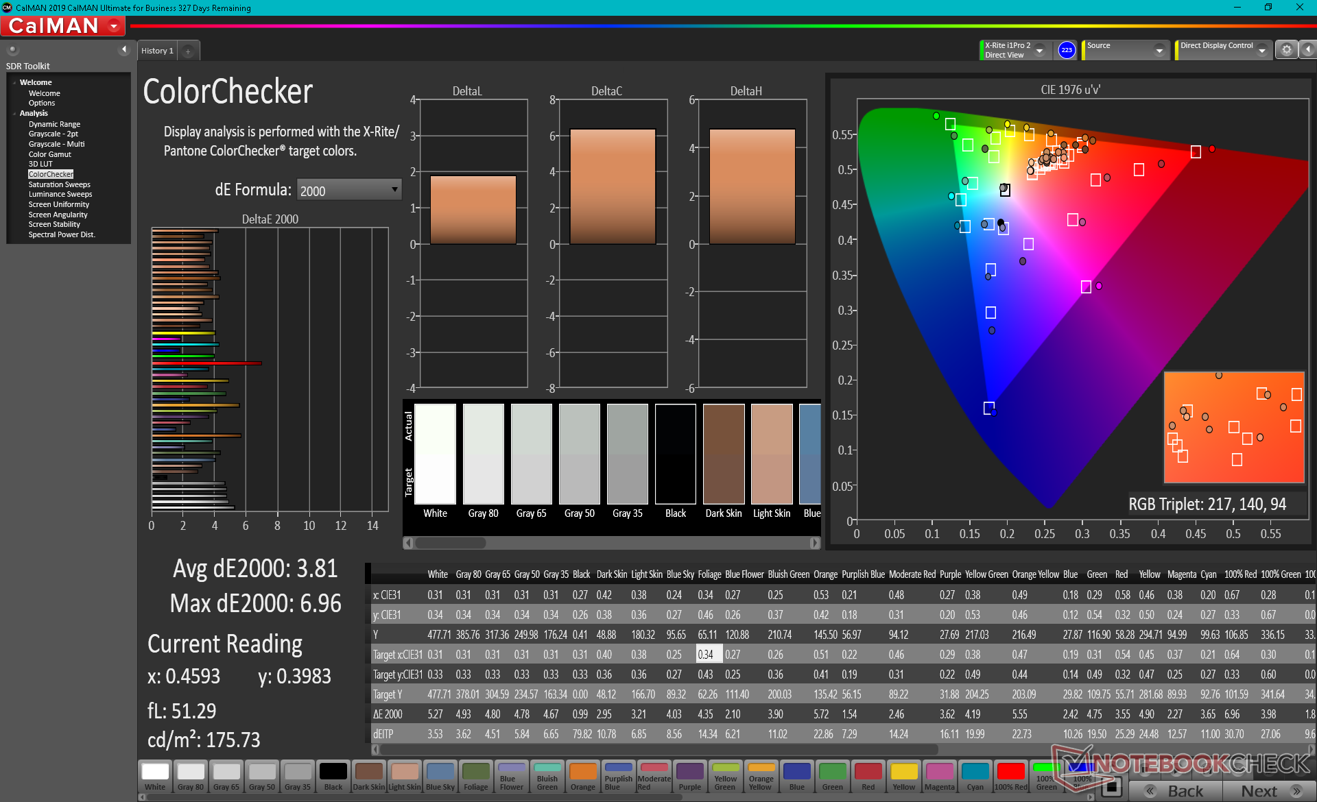 Das Display könnte im Lieferzustand besser kalibriert sein. Die durchschnittlichen Delta-E-Graustufen- und Farbwerte liegen bei 4,1 bzw. 3,81, was nicht schlecht ist. Angesichts des breiten Farbraums dieses Panels wäre aber sicherlich mehr möglich. Die Graustufenwerte würden sich durch eine Kalibrierung mit einem X-Rite-Farbspektrometer deutlich verbessern,