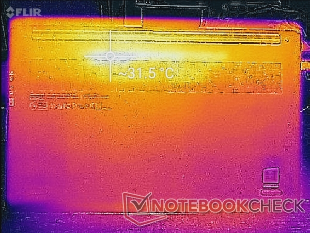 Die Hotspots sind unter starker Last auf der Tastatur deutlich kühler als auf der Unterseite der Basiseinheit. Beim Slim 7 und Yoga 9i war das anders. Hier erreicht die Tastatur maximal 37 °C, während sie bei den beiden genannten Mitstreitern bis zu 44 bzw. 43 °C erreichte. Die Hitzeentwicklung ist aufgrund des symmetrischen Kühlsystems auf beiden Seiten gleich.