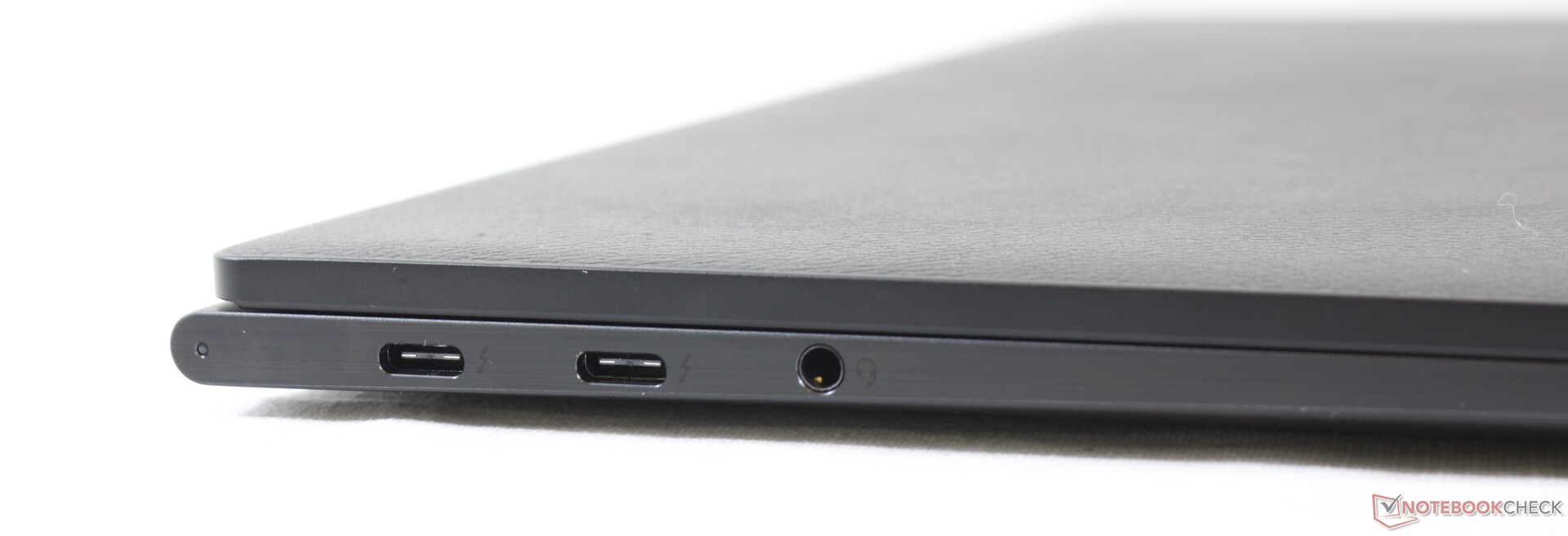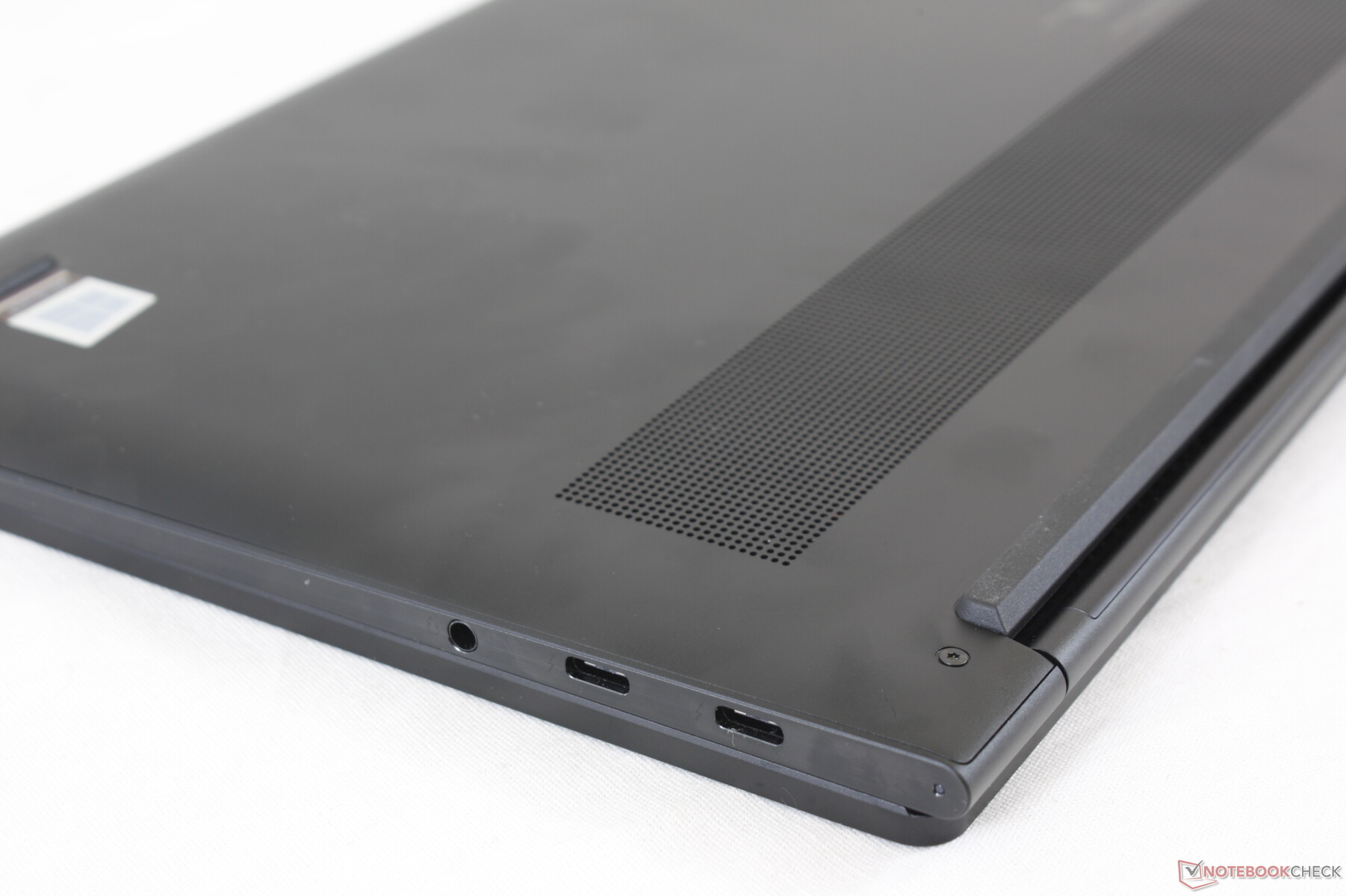 Die einzigen verfügbaren Anschlüsse sind drei USB-C-Ports und ein kombinierter 3,5-mm-Audioanschluss. Nutzer werden also des Öfteren auf Adapter zurückgreifen müssen. Alle USB-C-Ports unterstützen sowohl Thunderbolt 4 als auch die Ladefunktion. Nutzer, die sich USB-A- oder HDMI-Ports wünschen, sollten sich stattdessen das Yoga Slim 7 ansehen.