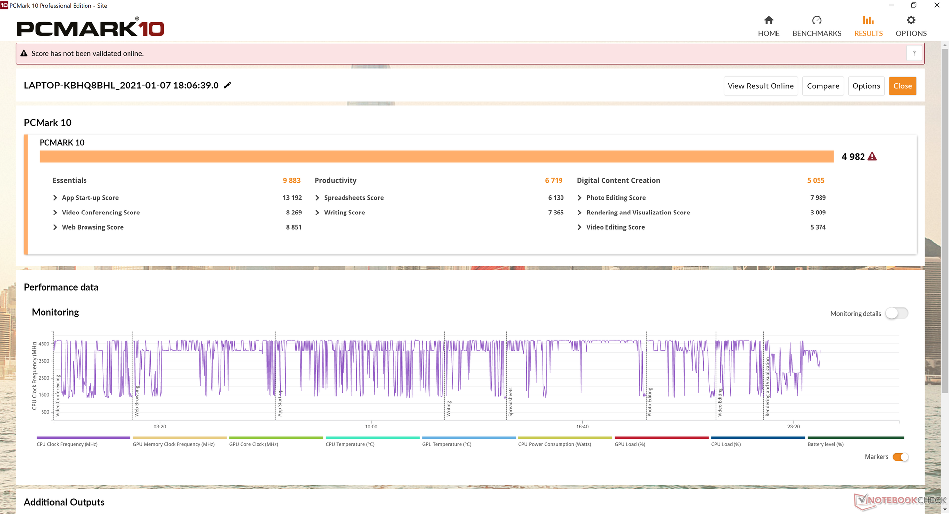 Im Leerlauf auf dem Desktop im geringsten Energieprofil und bei geringster Helligkeit nimmt unser Testgerät nur 4,5 Watt auf. Im Höchstleistungsmodus und bei maximaler Helligkeit benötigt das Gerät hier fast 11 Watt. Das Gamen zieht 45 W aus der Buchse, während das mit dem 7-nm-AMD-Ryzen-4800U ausgestattete Yoga Slim 7 in diesem Szenario 49 W fordert. Auch wenn Intel beim Einschrumpfen seiner Prozessknoten etwas hinterherhinkt, sind wir vom guten Verhältnis von Leistung pro Watt der 10-nm-Chips beeindruckt - besonders was die rohe Grafikleistung betrifft.