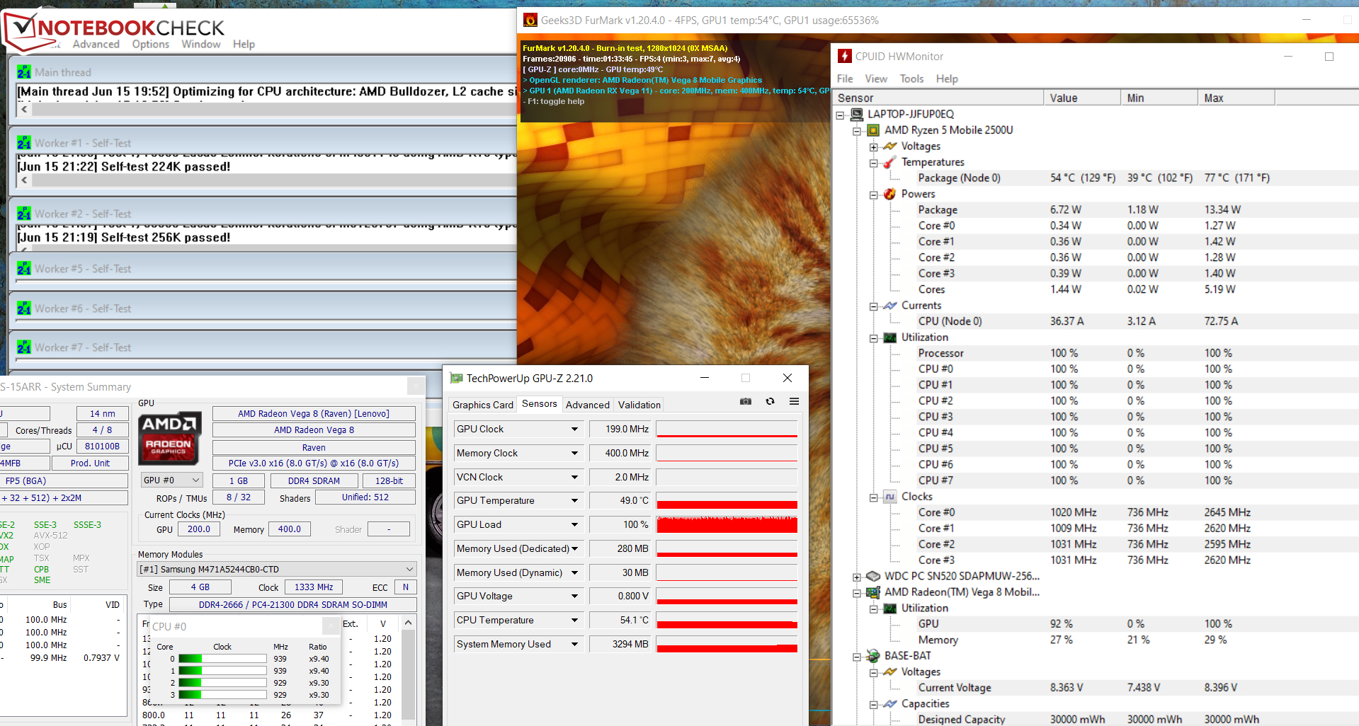 Unseren Stresstest (Prime95 und Furmark laufen für mindestens eine Stunde) durchläuft der Lenovo-Laptop im Netz- und im Akkubetrieb auf die gleiche Weise. Der Prozessor arbeitet zu Beginn des Tests mit 2,1 bis 2,2 GHz. Dann setzt eine Drosselung auf 1,5 bis 1,6 GHz ein. Auf diesem Niveau verharrt die CPU für lange Zeit. Im späteren Verlauf des Tests wird sie auf 1 GHz abgebremst. Der Grafikkern geht anfänglich mit 200 bis 300 MHz, später mit konstanten 200 MHz zu Werke. Der Stresstest stellt ein Extremszenario dar, welches so im Alltag nicht auftritt. Wir überprüfen mit diesem Test, ob das System auch bei voller Auslastung stabil läuft.