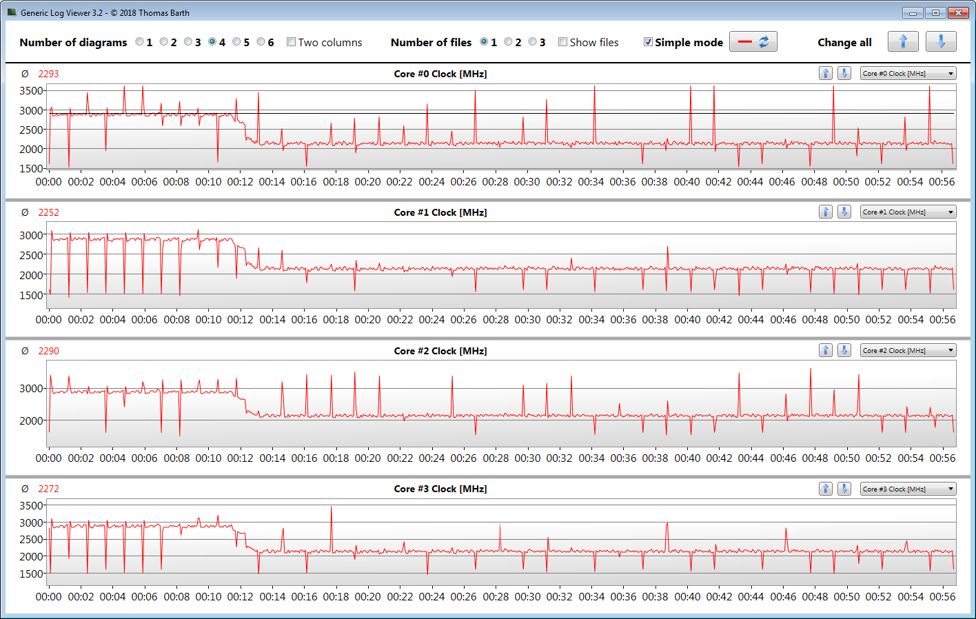 Ob der Turbo im Netzbetrieb auch dauerhaft genutzt wird, überprüfen wir, indem wir den Multi-Thread-Test des Cinebench-R15-Benchmarks für mindestens 30 Minuten in einer Dauerschleife laufen lassen. Für etwa 11 bis 12 Minuten kann die CPU eine Turbogeschwindigkeit von 2,8 bis 2,9 GHz halten, dann setzt eine Drosselung auf Werte knapp oberhalb von 2 GHz ein. Für die restliche Dauer des Tests verbleibt die CPU auf diesem Niveau.