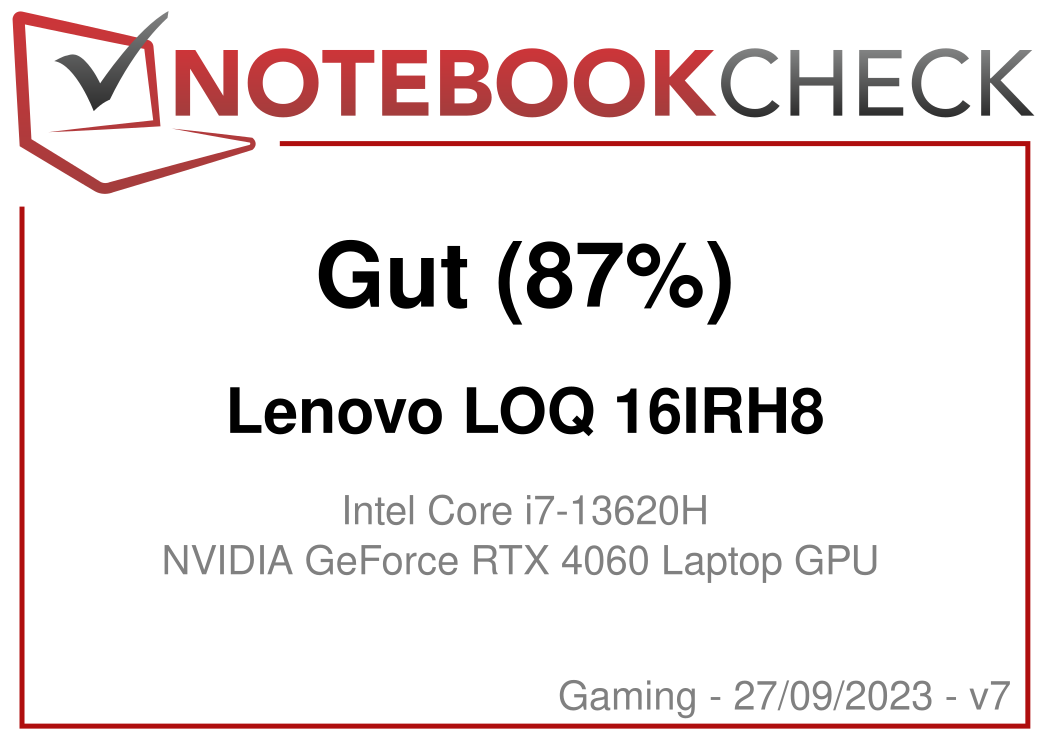 | 87.3 % v7 (old) | 09 / 2023 | Lenovo LOQ 16IRH8 i7-13620H, GeForce RTX 4060 Laptop GPU | 2.7 kg | 25.9 mm | 16.00" | 2560x1600 | |