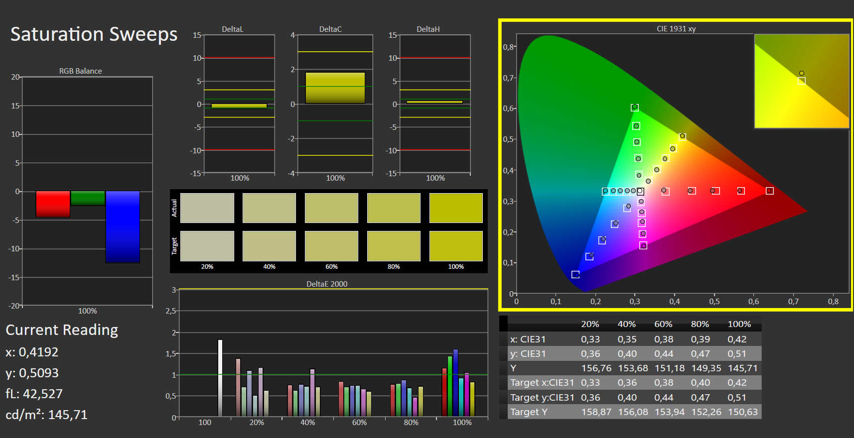 | Delta E Graustufen * | 2.57 | 3.9 -52% | 1.8 30% | 1.6 38% | 4.3 -67% | 5.5 -114% |
