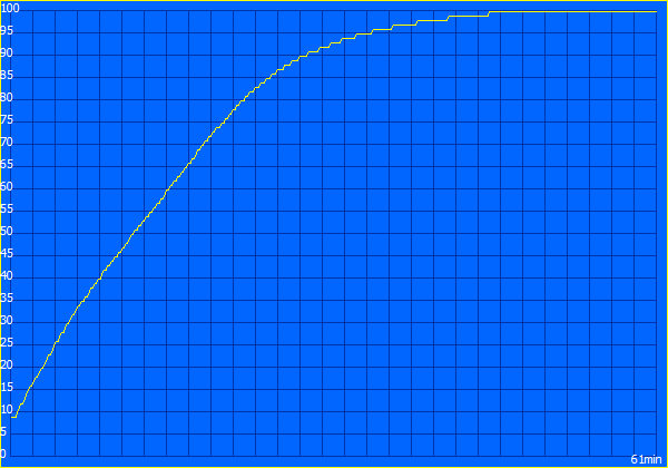 Das Gerät unterstützt Rapid Charge Pro, also das schnelle Laden des Akkus. Die Funktion kann in der Vantage-Software aktiviert werden und führt tatsächlich zu einer deutlichen Verkürzung der Ladedauer. Im normalen Modus ist die Ladekurve sehr linear und ein voller Ladevorgang dauert bei eingeschaltetem Gerät 102 Minuten. Mit aktivierter Schnelllade-Funktion sind es rund 40 Minuten weniger und 80 % sind nach gerade einmal 22 Minuten wieder verfügbar.