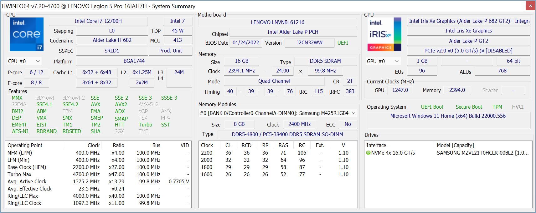 Lenovo setzt auf en brandneuen Intel Core i7-12700H, der aus der Alder-Lake-Generation stammt und auf eine Hybridstruktur mit 6 Performance-Kernen (max. 4,8 GHz, inklusive Hyperthreading) sowie 8 Efficiency-Kernen (max. 3,7 GHz) setzt. Insgesamt kann der Prozessor also bis zu 20 Threads gleichzeitig bearbeiten. Theoretisch handelt es sich um einen Prozessor der 45-Watt-Klasse, aber im Fall des Legion 5 Pro ist dem Prozessor kein Limit gesetzt. Bei voller Leistung auf allen Kernen steigt der Verbrauch damit auf 124 Watt und selbst in den Single-Core-Tests sind es knapp 25 Watt (IA-Kern). Mit Effizienz hat das nicht mehr viel zu tun, aber das Legion 5 Pro holt sich damit ganz locker die Spitzenposition in unseren CPU-Tests und kann auch den Core i9-12900H im MSI Vector hinter sich lassen. Zumindest in den Multi-Tests, denn bei den Single-Core-Tests profitiert der i9 von dem etwas höheren Takt.