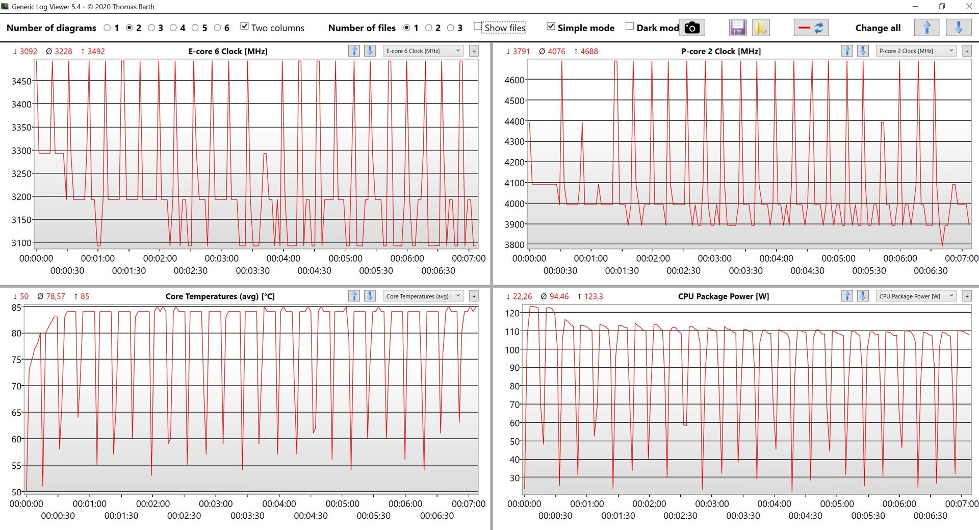 Die kompletten 124 Watt können nicht dauerhaft gehalten werden und der Prozessor pendelt sich irgendwann bei 108 Watt ein. Im Auto-Modus sind es etwa 2.700 Punkte in CB R15 Multi und immer noch rund 2.450 Punkte bei 80 Watt (Ruhemodus). Insgesamt ist die CPU-Leistung also hervorragend, was aber auch mit einem hohen Stromverbrauch einhergeht.