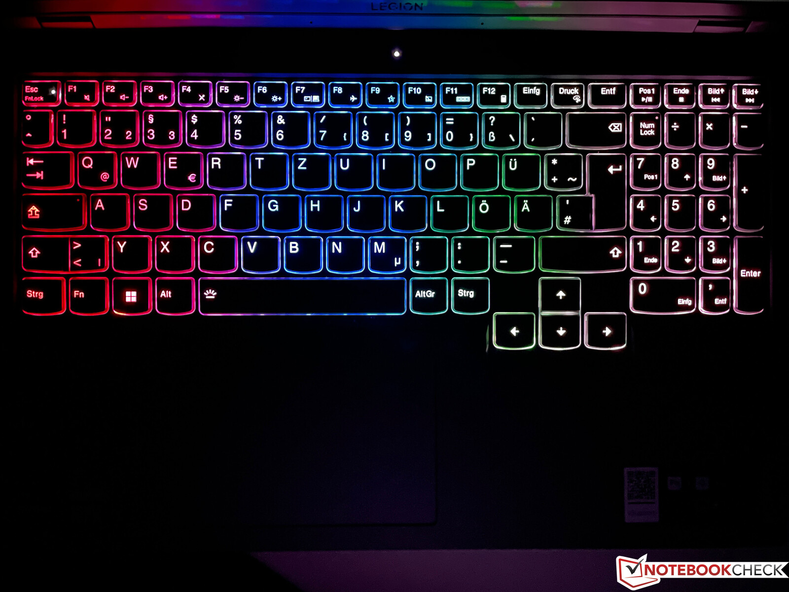 Die Tastatur bietet nach wie vor einen Hub von 1,5 mm und damit auch ein sehr komfortables Tippgefühl, weshalb das Legion auch problemlos für das Schreiben von längeren Texten genutzt werden kann. Die Pfeiltasten sind groß und etwas abgesetzt und es gibt auch einen vollwertigen Nummernblock, wobei die Tasten hier etwas schmaler ausfallen. Bei unserem Testgerät ist eine 4-Zonen-Beleuchtung verbaut, wobei man hier zwischen drei Profilen unterscheiden kann (eine einfarbige Beleuchtung ist auch möglich).
