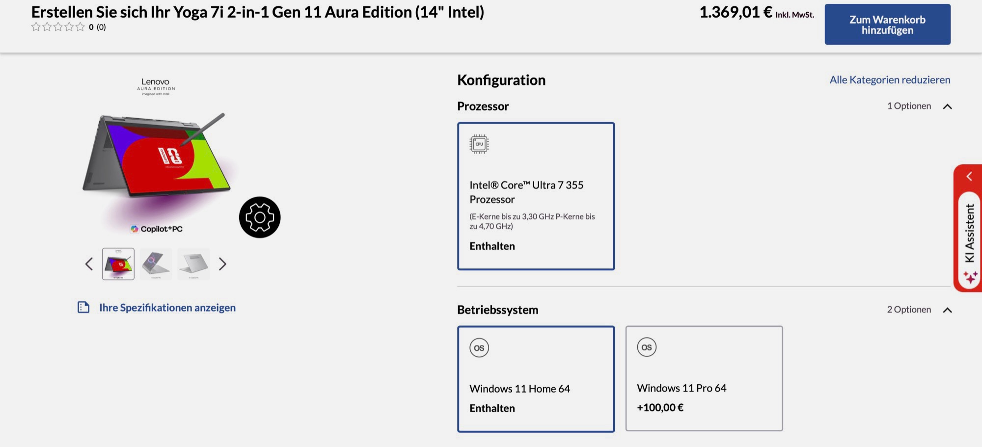 Nachdem Lenovo schon kurz nach der CES damit begonnen hat, Vorbestellungen für das Yoga Slim 7i Ultra Aura Edition entgegen zu nehmen, können nun zwei weitere Notebooks auf Basis von Intel Panther Lake direkt bei Lenovo Deutschland vorbestellt werden. Darunter das günstigere Lenovo Yoga 7i 2-in-1 Gen 11, das mit einem Intel Core Ultra 7 355 ausgestattet ist.