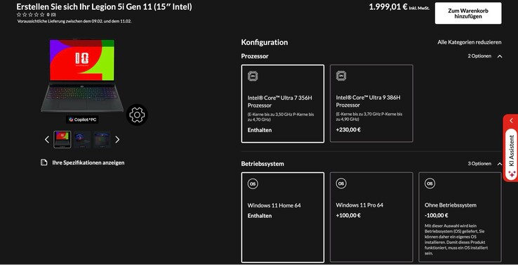 Das Basismodell bietet 16 GB RAM und eine 1 TB SSD. Der Arbeitsspeicher kann für 140 Euro auf 32 GB erweitert werden, ein Upgrade auf den schnelleren Intel Core Ultra 9 386H kostet 230 Euro. Schnellere Grafikchips stehen aktuell nicht zur Auswahl. Lenovo verbaut stets einen 80 Wh Akku, eine 5 MP Webcam, eine Tastatur mit RGB-Beleuchtung und ein 15,3 Zoll OLED-Display mit einer Auflösung von 2.560 x 1.600 Pixel, einer Bildfrequenz von 165 Hz und einer HDR-Spitzenhelligkeit von 1.000 Nits.