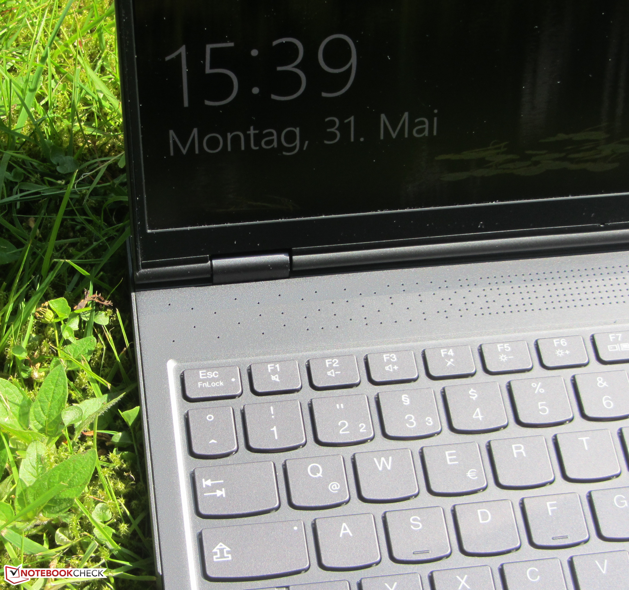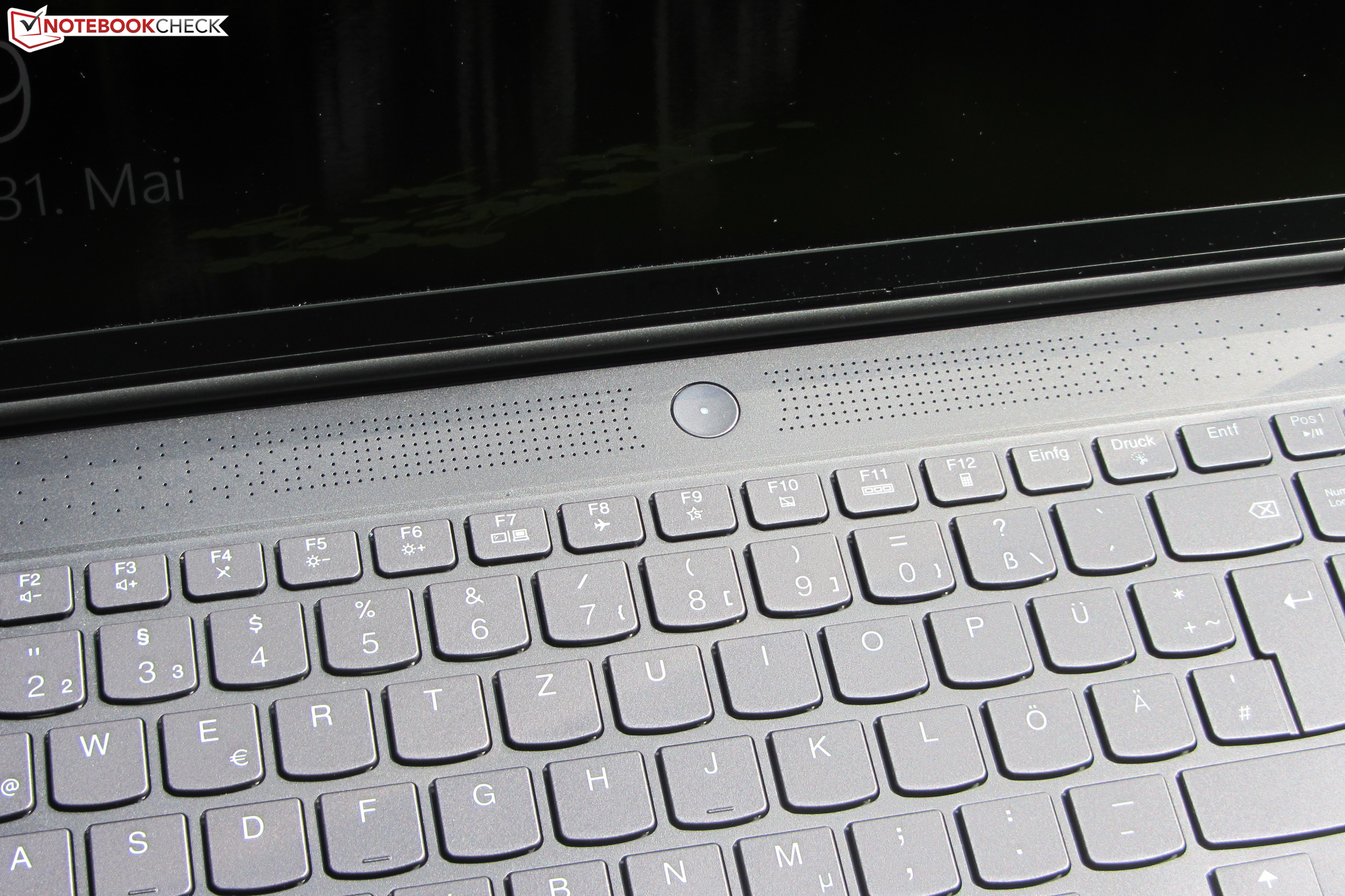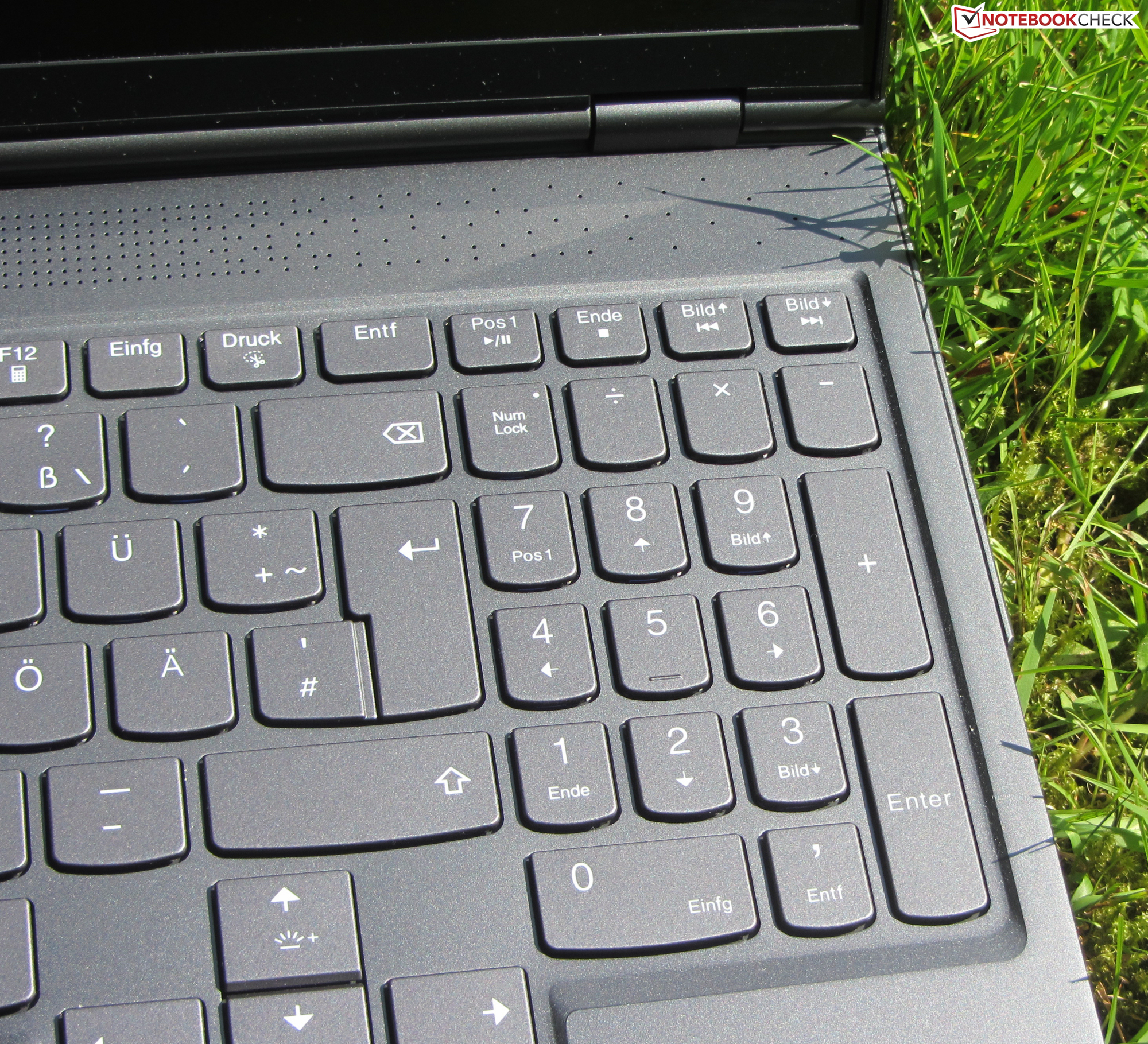 Die ebenen, glatten Tasten der beleuchteten Chiclet-Tastatur verfügen über einen kurzen Hub und einen deutlichen Druckpunkt. Der Tastenwiderstand gefällt uns. Während des Tippens gibt die Tastatur nicht nach. Die Helligkeit der Tastenbeleuchtung (drei Helligkeitsstufen) wird mittels zweiter Funktionstasten gesteuert. Alles in allem liefert Lenovo hier eine alltagstaugliche Tastatur.