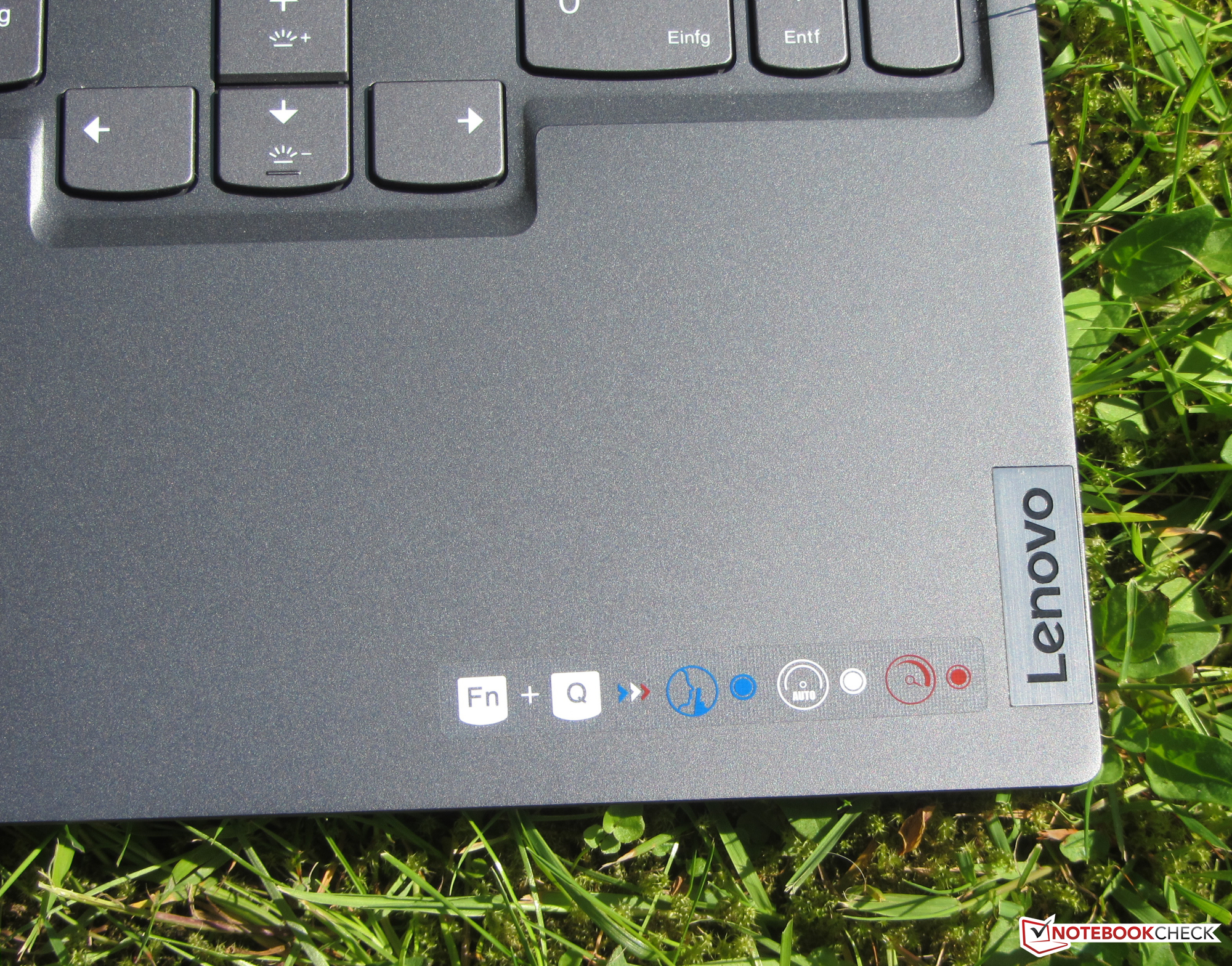 Während das Notebook grundsätzlich dezent gestaltet ist, kann es doch auffallen. Lenovo verbaut Beleuchtungselemente (LED-Leiste auf der Unterseite, beleuchtete Luftauslässe), die synchron mit der Tastenbeleuchtung laufen. Zur Lichtshow gesellt sich noch das illuminierte "Y" innerhalb des Lenovo Logos auf der Deckelrückseite.