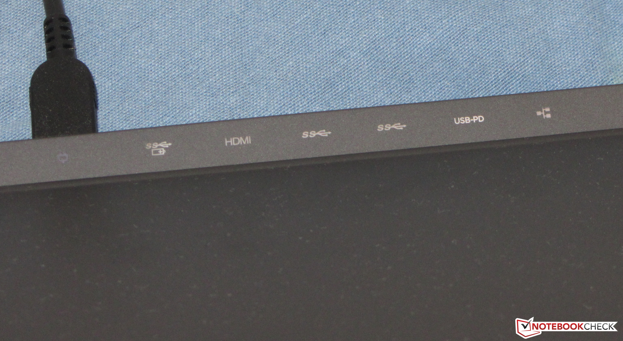 Die Anschlüsse verteilen sich auf drei Seiten des Notebooks. Ein Großteil der Steckplätze befindet sich auf der Rückseite des Geräts. Somit verlaufen angeschlossene Kabel nach hinten und liegen nicht im Weg. Ein Lob gebührt der beleuchteten Beschriftung der rückseitigen Steckplätze. Diese erleichtert das blinde Anstöpseln eines Steckers ungemein.