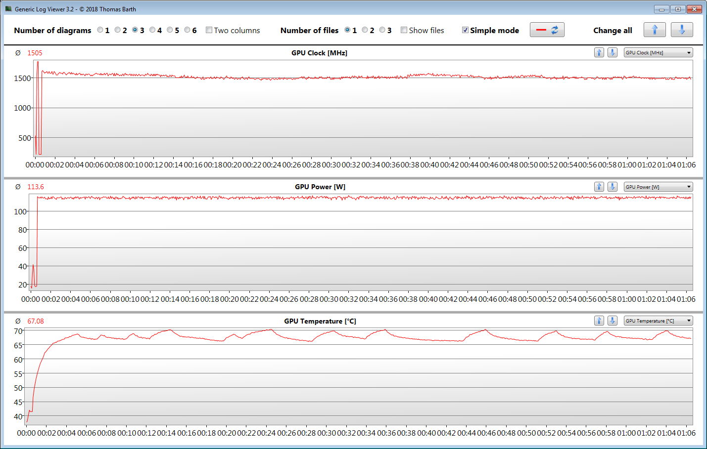 Das folgende Diagramm verdeutlicht die recht konstante Leistungsaufnahme des Notebooks während diverser von uns durchgeführter Tests. Einen Einbruch der Rechenleistung gab es nicht.