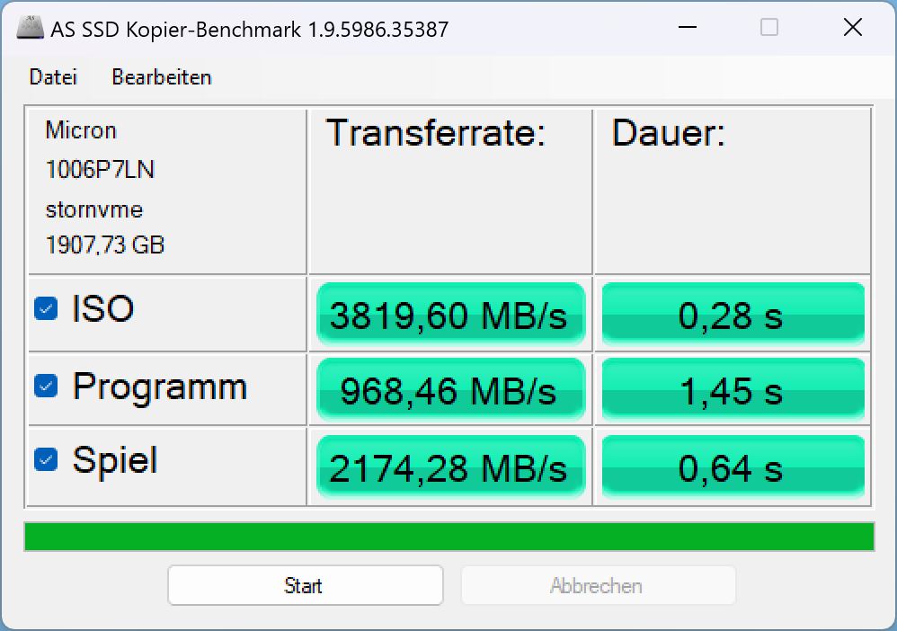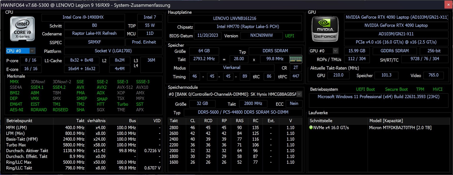 | Lenovo Legion 9 16IRX9, RTX 4090 i9-14900HX, GeForce RTX 4090 Laptop GPU, Micron 3400 2TB MTFDKBA2T0TFH, MiniLED, 3200x2000, 16" | Lenovo Legion 9 16IRX8 i9-13980HX, GeForce RTX 4090 Laptop GPU, 2x SK Hynix HFS001TEJ9X115N (RAID 0), Mini-LED, 3200x2000, 16" | Razer Blade 16 2024, RTX 4090 i9-14900HX, GeForce RTX 4090 Laptop GPU, Samsung PM9A1 MZVL22T0HBLB, OLED, 2560x1600, 16" | Asus ROG Strix Scar 18 G834JYR (2024) i9-14900HX, GeForce RTX 4090 Laptop GPU, Samsung PM9A1a MZVL22T0HDLB, Mini LED, 2560x1600, 18" | Medion Erazer Beast X40 2024 i9-14900HX, GeForce RTX 4090 Laptop GPU, Phison E18-1TB-PHISON-SSD-BICS5, IPS, 2560x1600, 17" | Durchschnittliche NVIDIA GeForce RTX 4090 Laptop GPU | Durchschnitt der Klasse Gaming | |