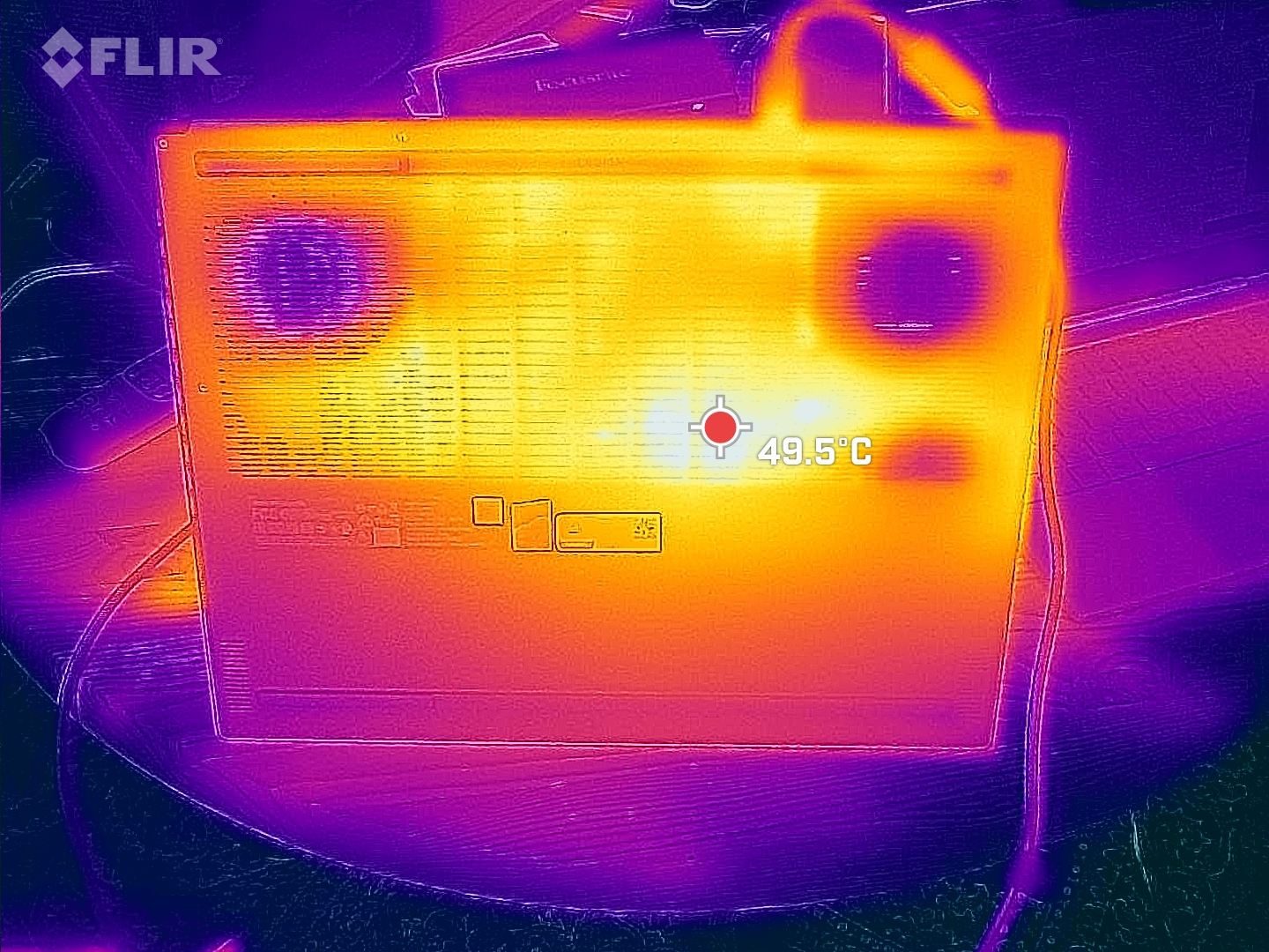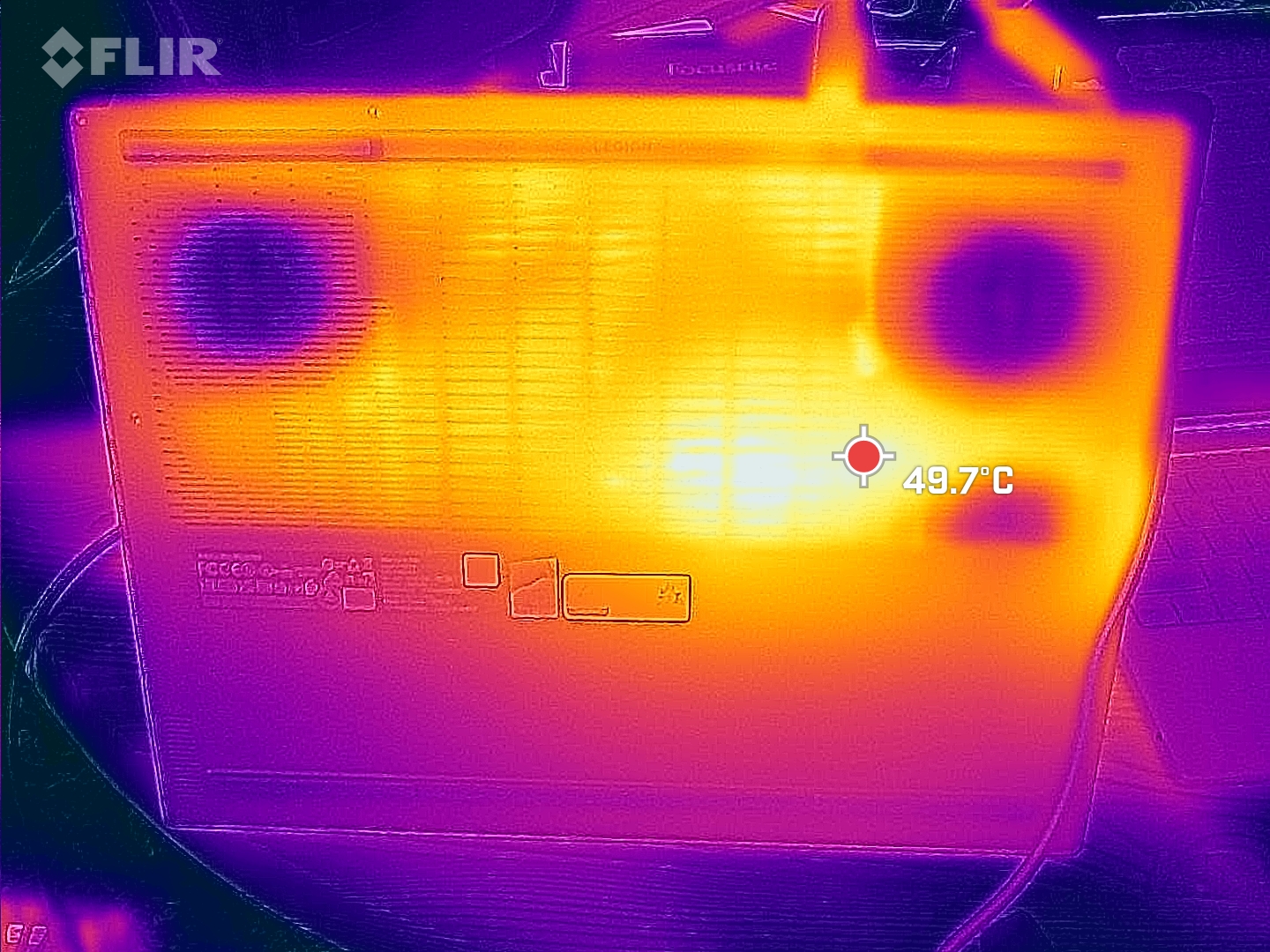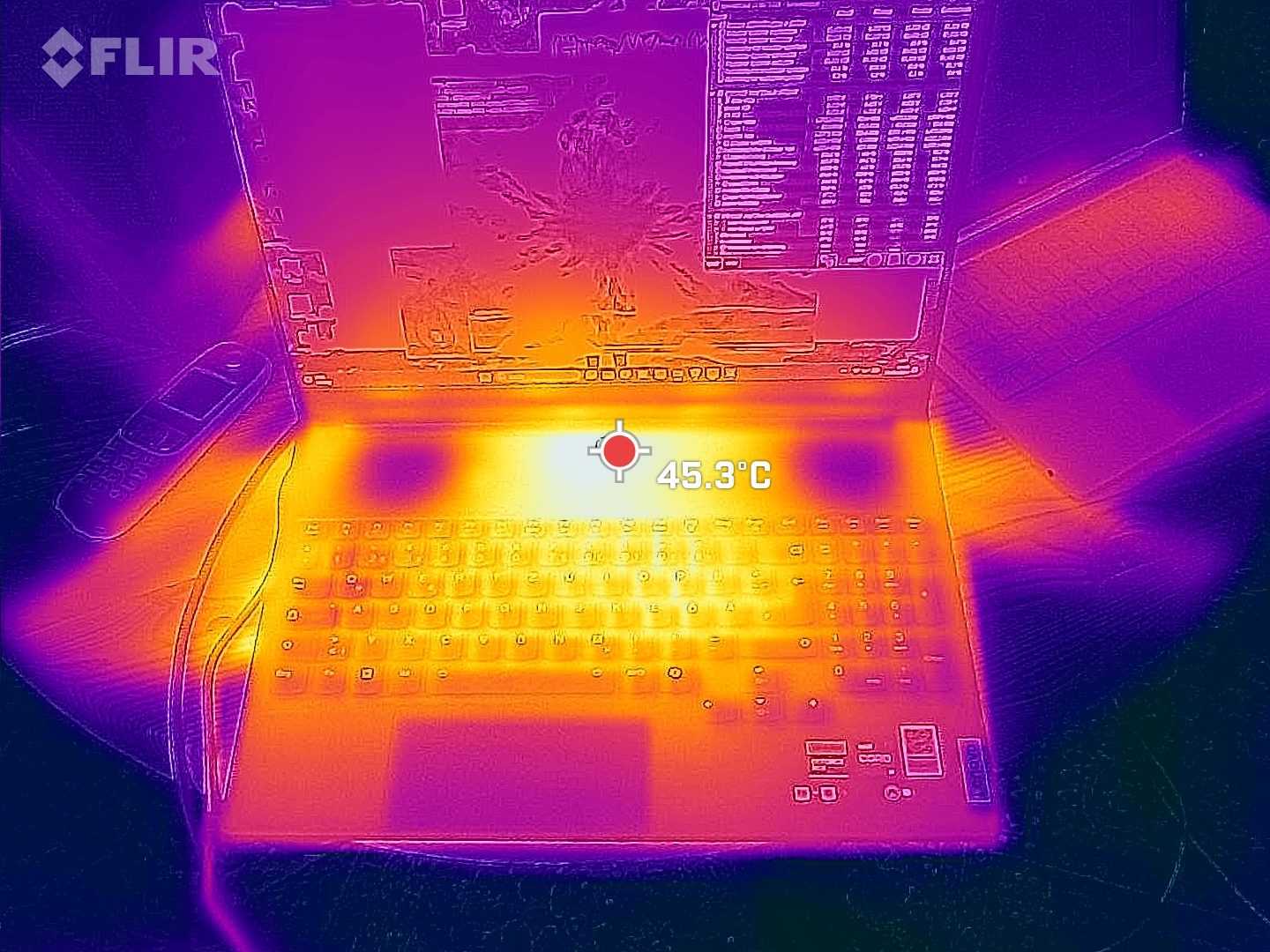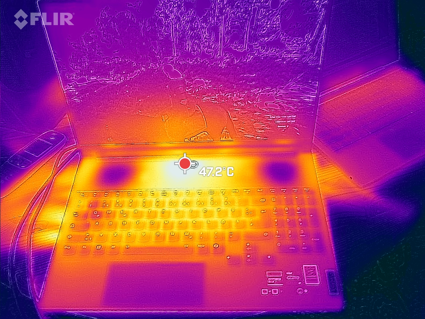 Trotz recht lautem Kühlsystem sind die Temperaturen im Vergleich eher hoch. Die Hot Spots beim Gaming und anderen starken Lasten liegen zentral und zum Bildschirm hin. Auch rund um die WASD-Tasten kann es mit 46 °C recht warm werden. Zumindest die Handballenauflagen bleiben im moderaten Bereich. Schon der Vorgänger agierte hier nicht optimal, aber offensichtlich hat Lenovo nicht nachgebessert.