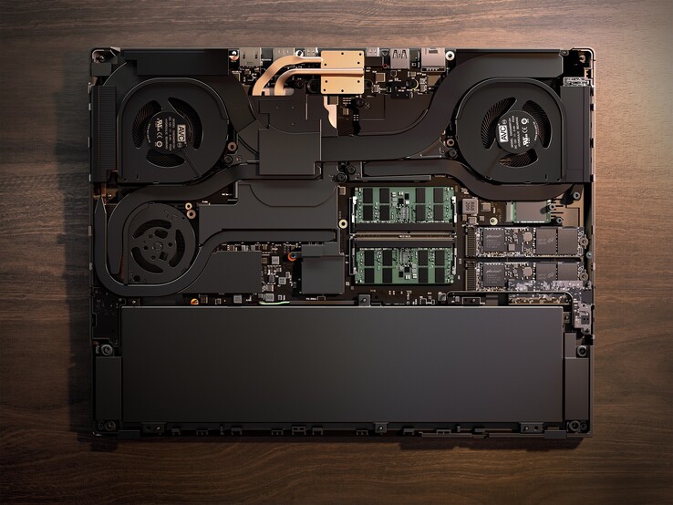 Käufer haben die Wahl zwischen 32 GB LPDDR5-6.400- oder 64 GB LPDDR5-5.600-Arbeitsspeicher. Dazu gibts eine bis zu 2 TB große PCIe 4.0 SSD. Während der Laptop in den USA Wi-Fi 7 unterstützt, müssen sich Käufer in Europa mit Wi-Fi 6E begnügen. In Verbindung mit Bluetooth 5.1, dreimal USB-C, davon zweimal mit Support für Thunderbolt 4, zweimal USB-A, HDMI 2.1, RJ45 und einem SD-Kartenleser bietet das Gerät eine breite Anschluss-Auswahl.
