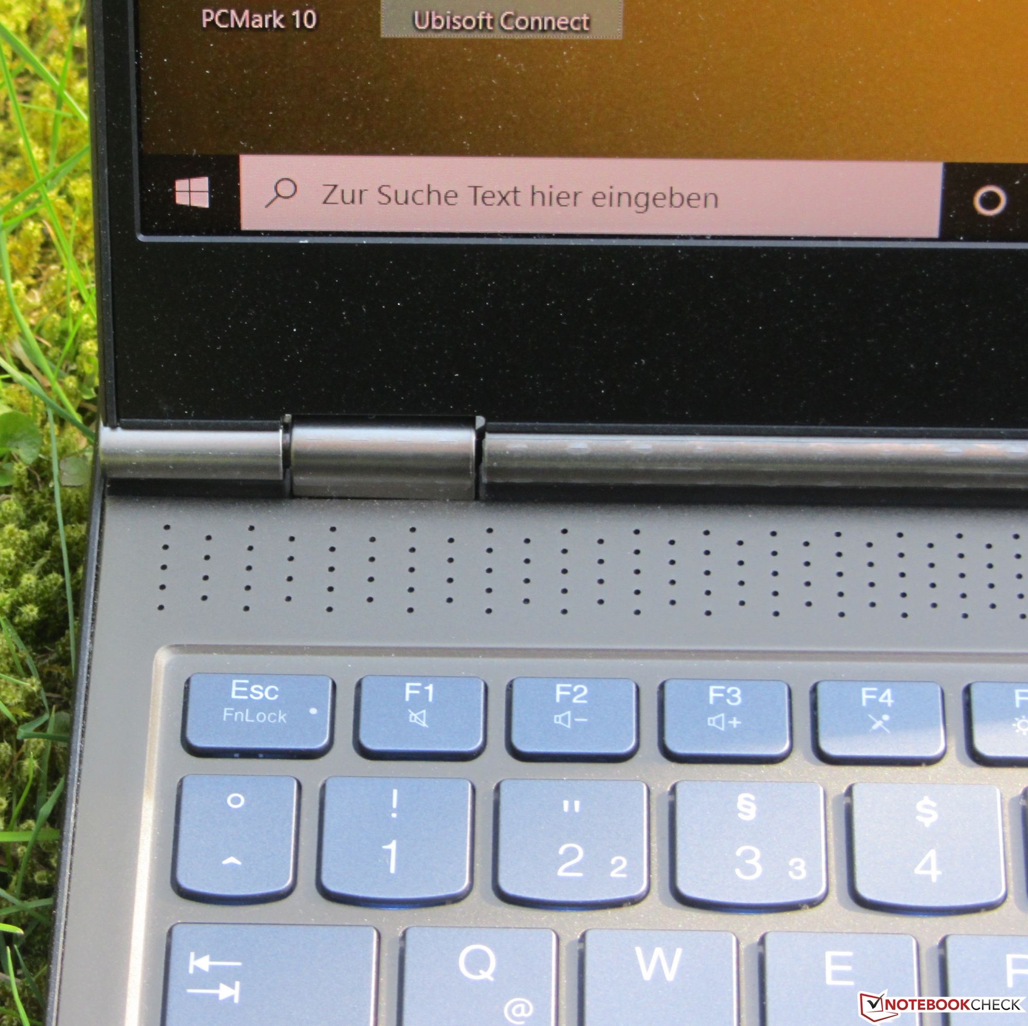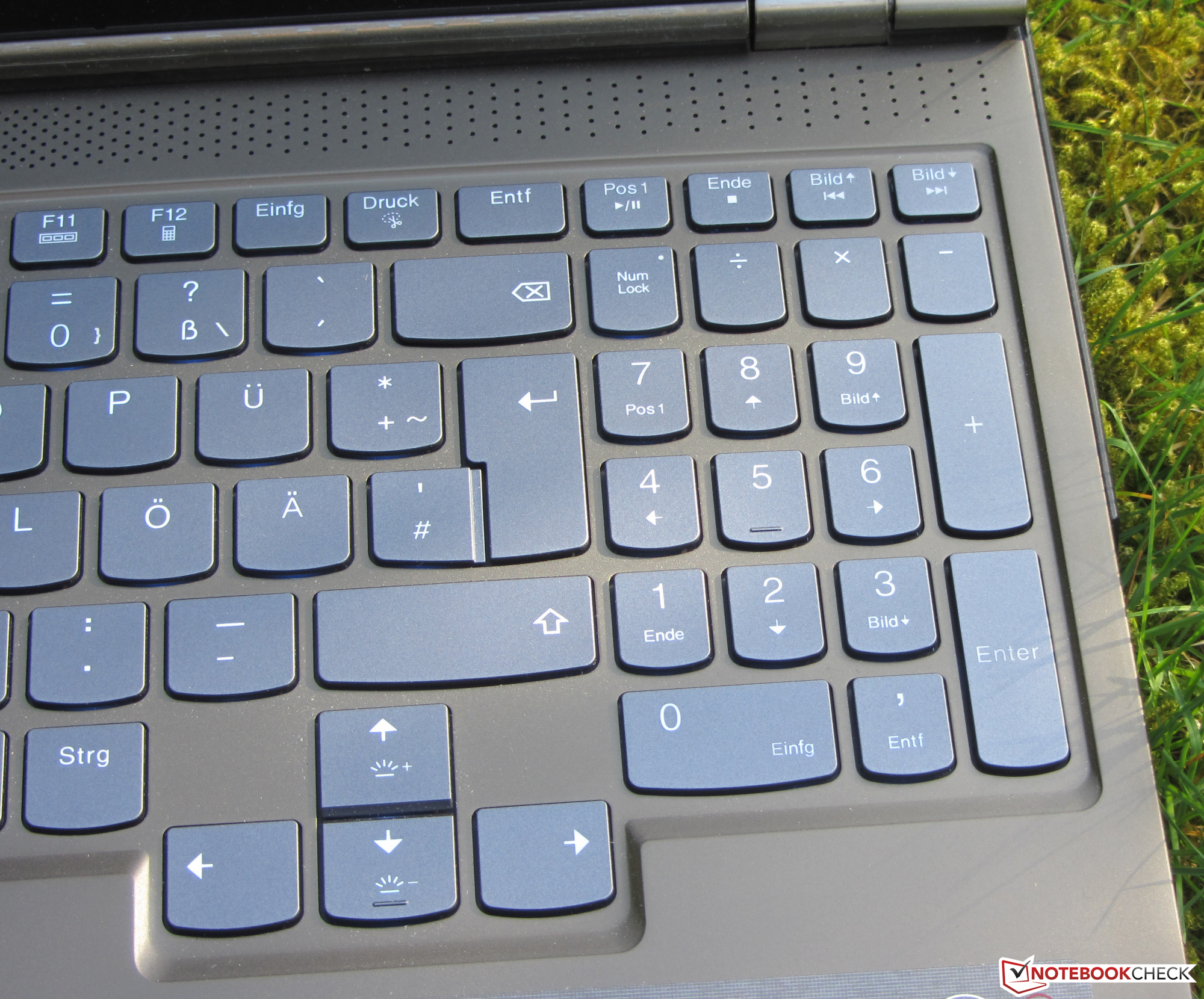 Die ebenen, glatten Tasten der beleuchteten Chiclet-Tastatur verfügen über einen kurzen Hub und einen deutlichen Druckpunkt. Der Tastenwiderstand dürfte für unseren Geschmack eine Spur knackiger ausfallen. Während des Tippens gibt die Tastatur in der Mitte etwas nach. Als übermäßig störend hat sich das nicht erwiesen. Die Tastenbeleuchtung (drei Helligkeitsstufen) wird mittels zweier Funktionstasten gesteuert. Alles in allem liefert Lenovo hier eine alltagstaugliche Tastatur.