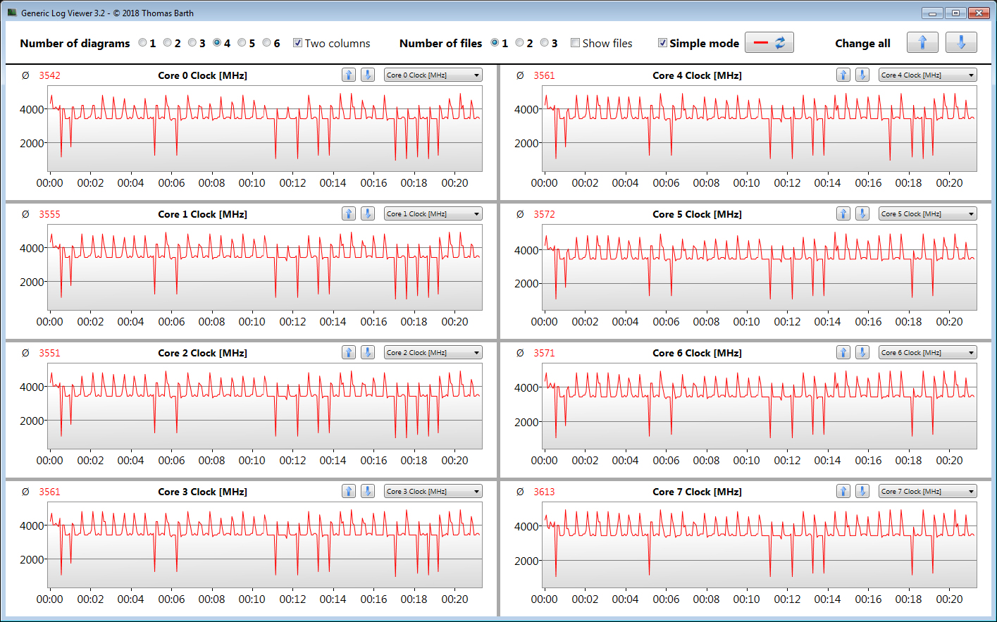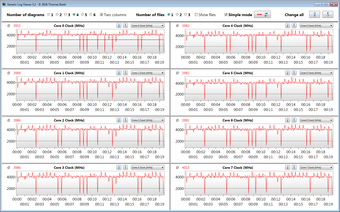 Der Multi-Thread-Test des Cinebench-R15-Benchmarks wird mit 4 bis 4,2 GHz (Netzbetrieb) bzw. 2,3 bis 3,6 GHz (Akkubetrieb) bearbeitet. Der Single-Thread-Test wird stets mit 4,2 bis 4,8 GHz durchlaufen.