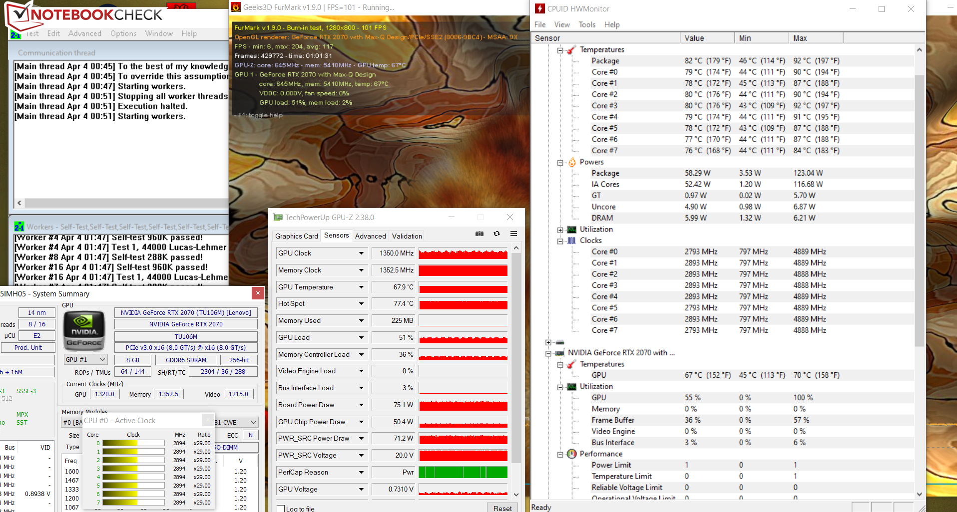 Unseren Stresstest (Prime95 und Furmark laufen für mindestens eine Stunde) bearbeiten CPU bzw. GPU mit 2,9 GHz bzw. 1.300 bis 1.400 MHz. Im Akkubetrieb liegen die Werte bei 600 bis 900 MHz (CPU) bzw. 900 bis 1.100 MHz (GPU). Der Stresstest stellt ein Extremszenario dar. Wir überprüfen mit diesem Test, ob das System auch bei voller Auslastung stabil läuft.
