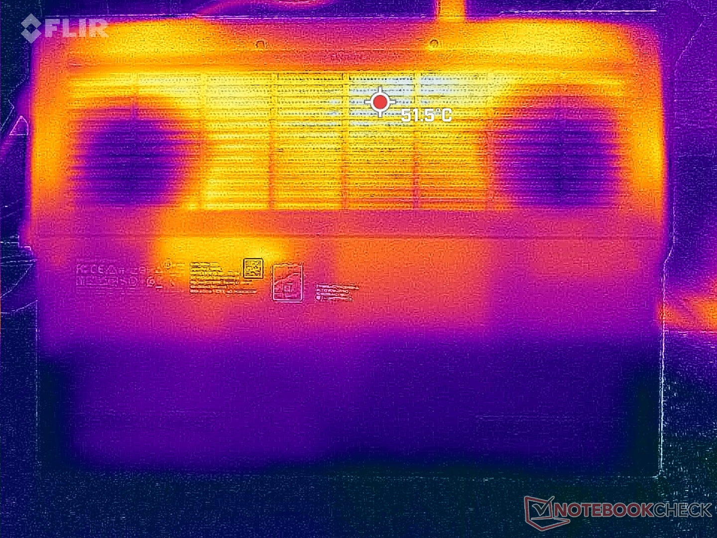 (-) Auf der Unterseite messen wir eine maximalen Wert von 50 °C (im Vergleich zum Durchschnitt von 43.3 °C).