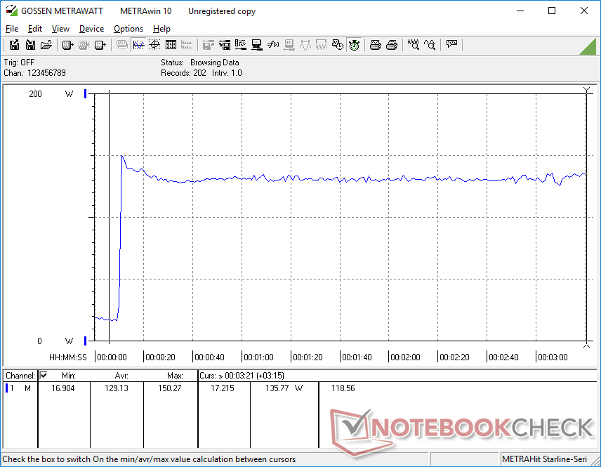 Die maximale Energieaufnahme aus dem mittelgroßen 170-W-Netzadapter (17 x 7,6 x 2,1 cm) lag bei 161 W. Die Mitstreiter Blade 14 und Zephyrus G14 werden mit stärkeren Netzadapter mit 230 bzw. 240 W versandt. Das Lenovo-Modell lädt langsamer, wenn es gleichzeitig stark belastet wird.