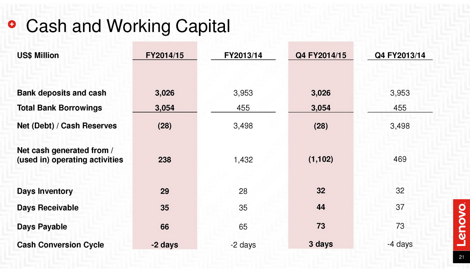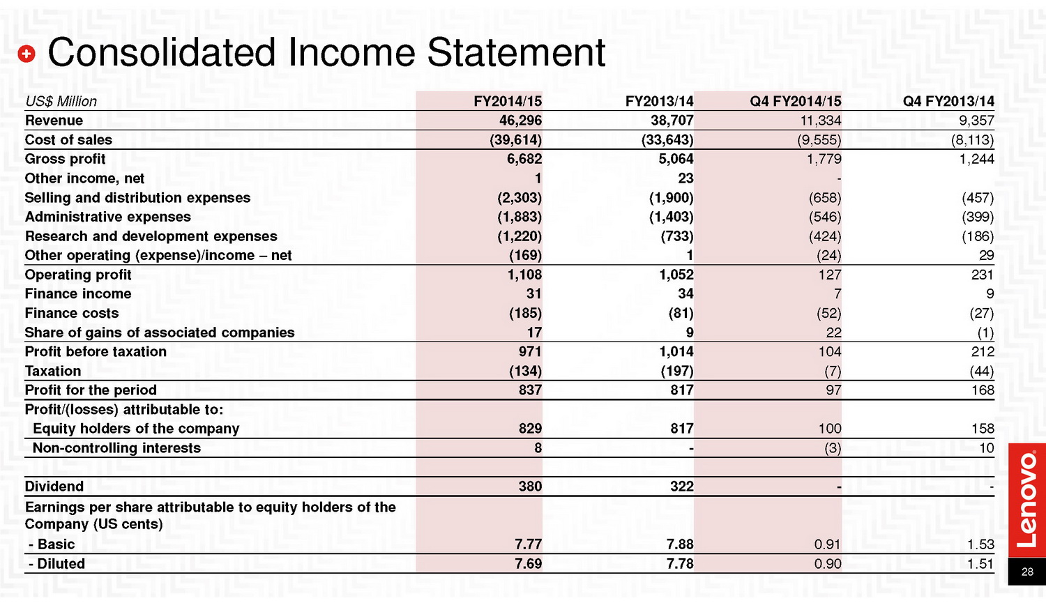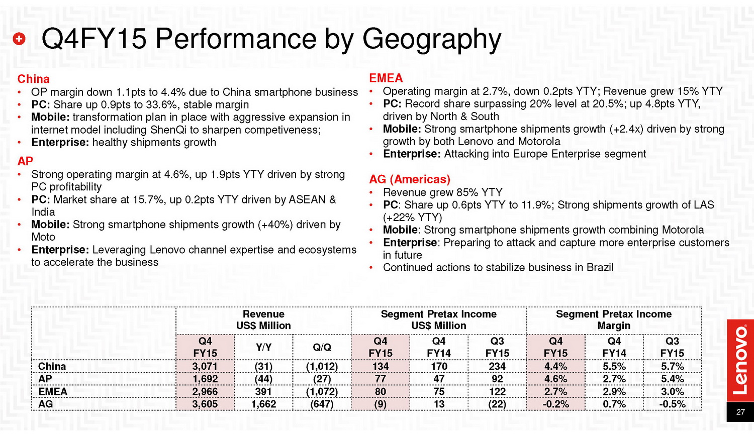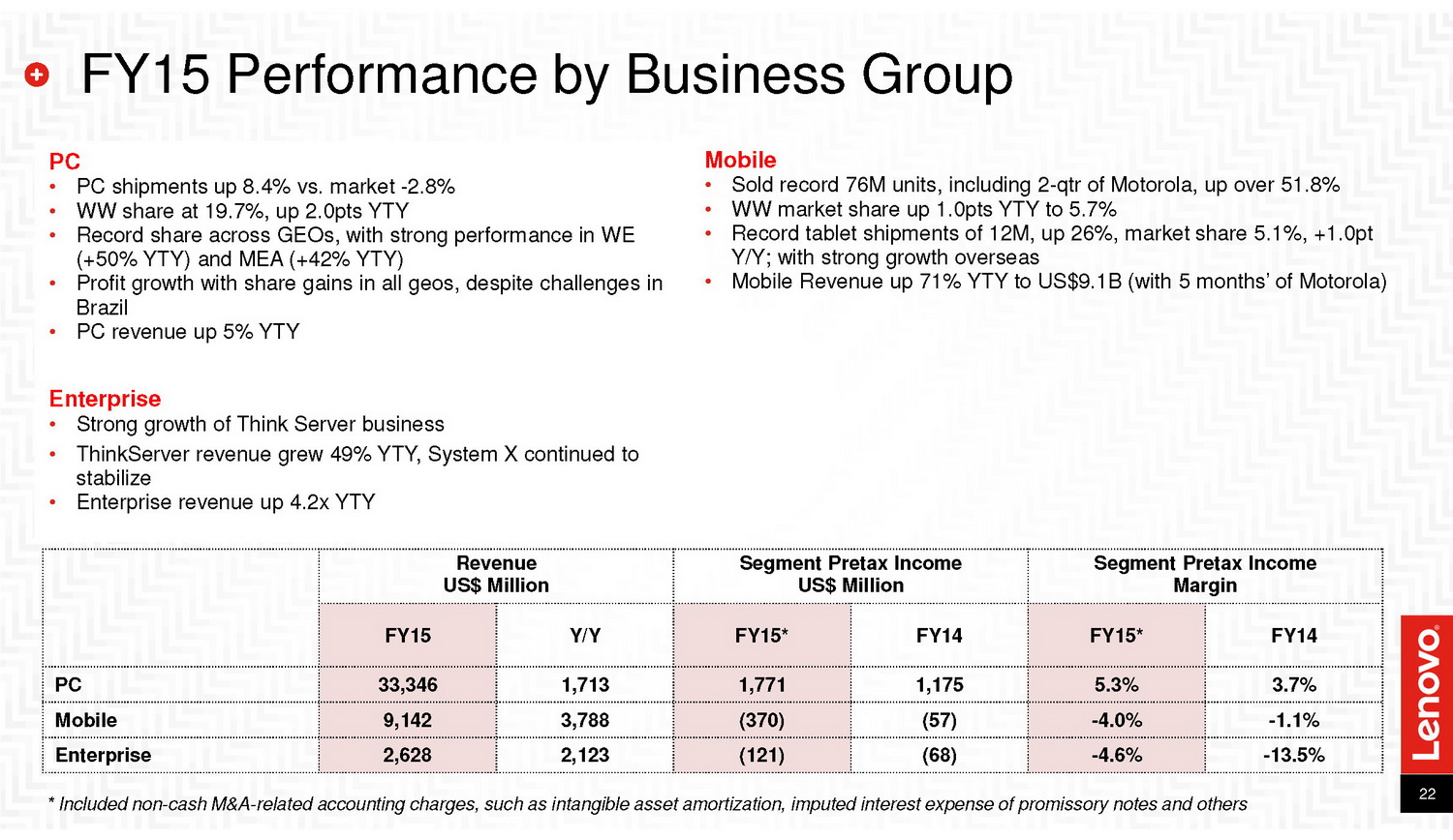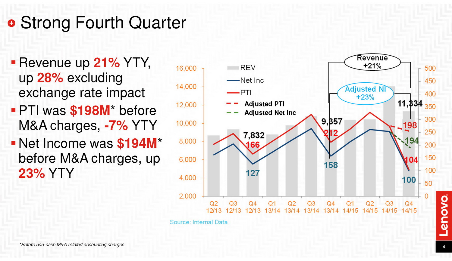 Für das gesamte abgelaufene Geschäftsjahr meldete Lenovo einen Umsatzanstieg um fast 20 Prozent. Der Umsatz kletterte von 38,707 Mrd. US-Dollar im FY2013/14 auf 46,296 Mrd im Geschäftsjahr 2014/15. Der operative Gewinn stieg um 5,3 Prozent, von 1,052 auf 1,108 Mrd. USD. Die PC-Sparte von Lenovo blieb mit einem Jahresumsatz von 33,35 Milliarden Dollar der wichtigste Geschäftsbereich. Für den Bereich Mobile meldete Lenovo einen Verkaufsrekord von 76 Millionen Geräten.