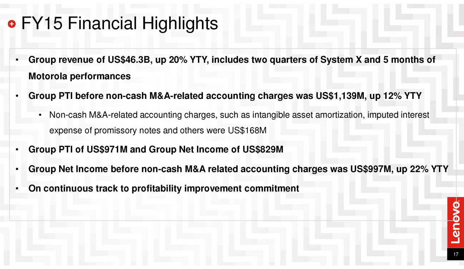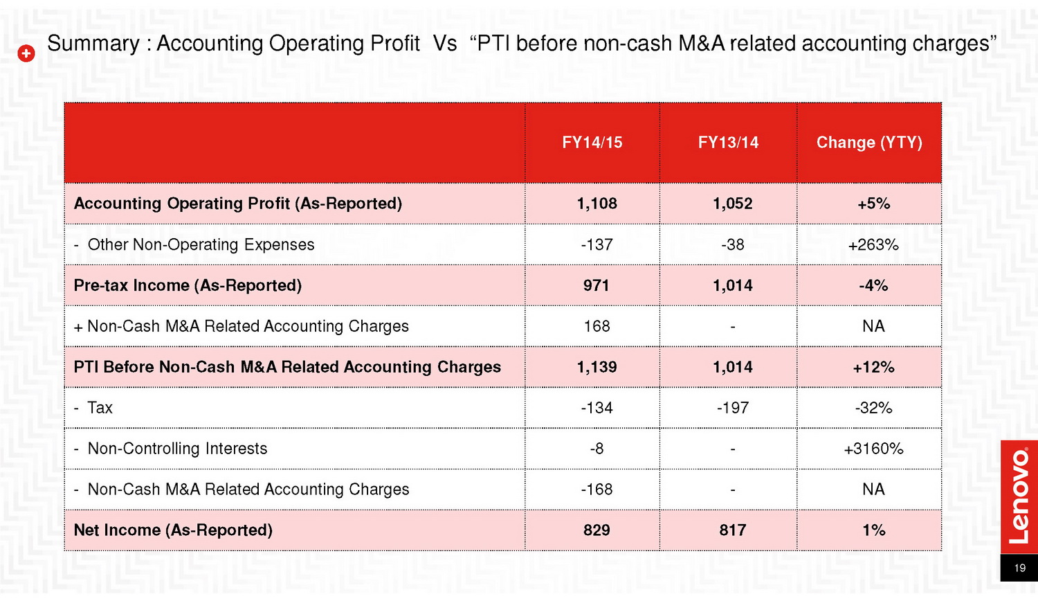 Als Grund für den deutlichen Gewinnrückgang im ersten Quartal 2015 führt der chinesische Computerriese die Kosten für die Übernahmen von Motorola Mobility und der Serversparte von IBM an. Die Übernahme von Motorola Mobility wurde im 4. Quartal mit rund 2,91 Mrd. Dollar abgeschlossen. Die IBM Serversparte kostete Lenovo 2,1 Milliarden US-Dollar.