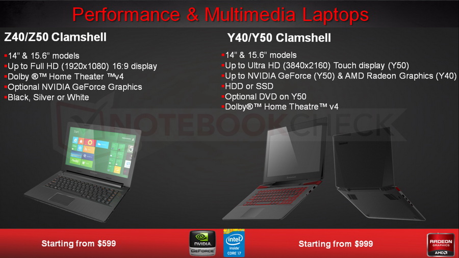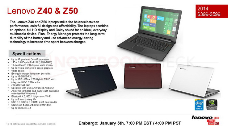 Der weltweit größte PC-Hersteller Lenovo zeigt in Las Vegas auf der CES 2014 auch Neuzugänge seiner konventionellen Notebooks. Zuvor hatte Lenovo bereits seine Neuvorstellungen bei den Smartphones, Multimodes und Think Products vorgestellt. Für das Segment der Multimedia-Notebooks bringt Lenovo die Einsteiger-Serien Z40 (14") und Z50 (15,6") sowie die Premium-Modelle Y40 und Y50 (14 und 15,6 Zoll) auf den Markt.