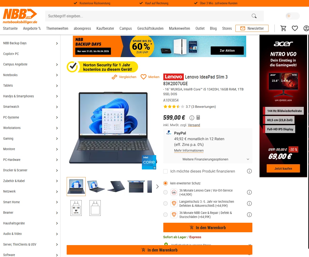 Die IdeaPad-Slim3-Reihe der Firma Lenovo steht für einfache Office-Notebooks, die keine allzu tiefen Krater in den Geldbeutel schlagen. Aktuell führt Notebooksbilliger.de mit dem IdeaPad Slim 3 16IRH10 83K2007UGE ein Intel-basiertes 16-Zoll-Modell der Reihe zu einem Angebotspreis von 599 Euro im Sortiment. Es musste sich noch kein Abkömmling der Reihe einem unserer Tests stellen.