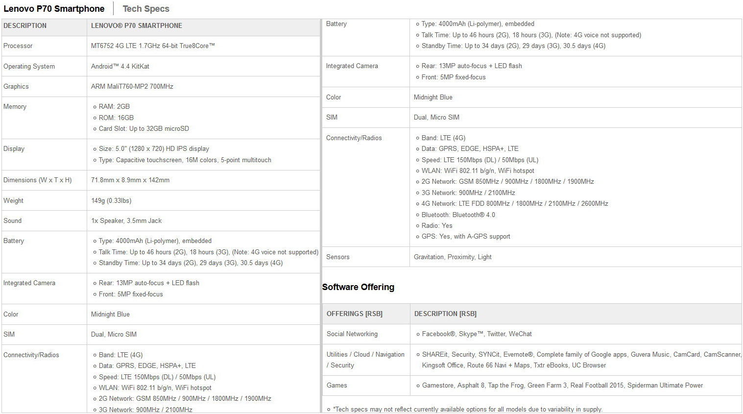 Damit soll das P70 Smartphone eine Gesprächszeit von bis zu 18 Stunden im 3G-Betrieb erreichen. Als Stand-by-Zeit nennt Lenovo für das P70 bis zu 29 Tage. Der integrierte 64 Bit fähige und ARM Cortex-A53 basierte 4G-LTE-Chipsatz MT6752 (1,7 GHz) ist ein 8-Kern-Chip von MediaTek und erlaubt Downloadraten von bis zu 150 Mbps (50 Mbps Upload). Neben WLAN 802.11 b/g/n ist auch Bluetooth 4.0 und A-GPS an Bord.