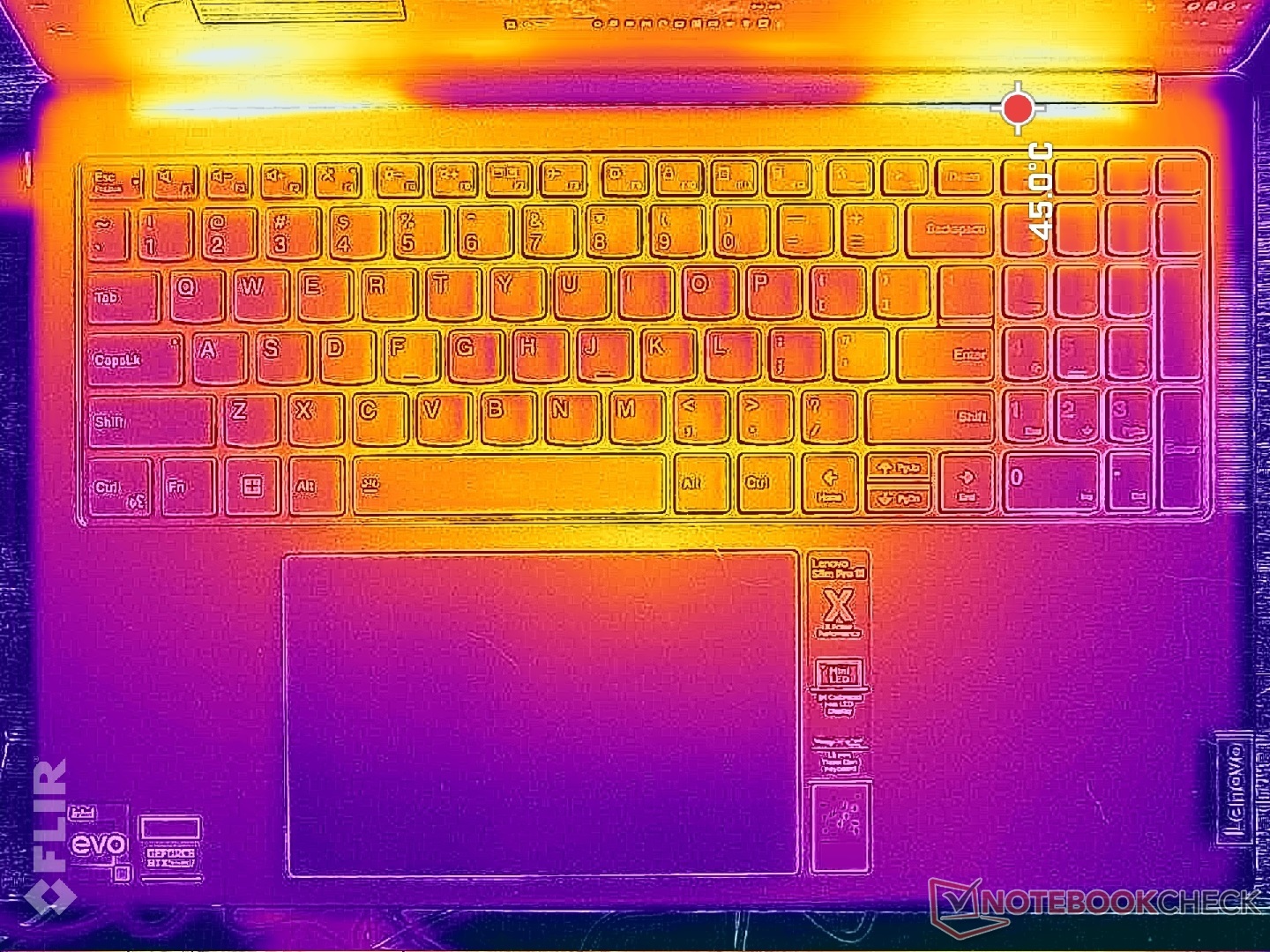 Die Oberflächentemperaturen sind in der Nähe der mittleren Bereiche am wärmsten, wo Hotspots über 38 °C auf der Oberseite und 44 °C auf der Unterseite erreichen können. Die Tastatur des Lenovo ist nicht so warm wie die des Inspiron 16 Plus 7620, wo die Mitte unter Last bis zu 50 °C erreichen kann.