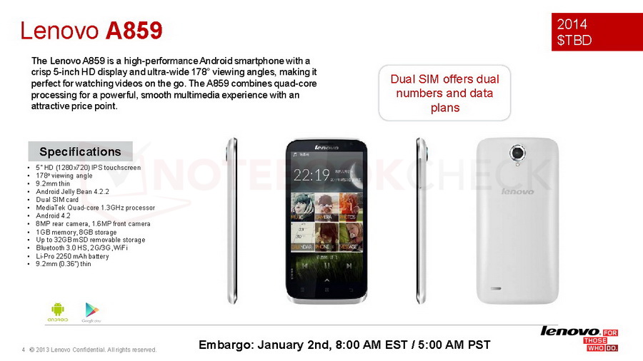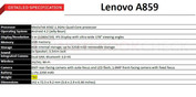 Mit dem A859 stellt Lenovo auf der CES 2014 die vierte Neuheit in seinem Geschäftsbereich der Mobiltelefone vor. Lenovo nennt sein 9,2 Millimeter flaches A859 selbst ein High-Performance-Smartphone, das wie die beiden neuen S-Phones mit Android 4.2 Jelly Bean und MediaTek MT6582 Quadcore @1,3 GHz auftritt. Das Dual-SIM-Phone integriert zudem ein 5 Zoll großes HD-IPS-Display (178° VA) mit einer Auflösung von 1.280 x 720 Pixeln sowie 2 Kameras (8 MP mit LED-Blitz hinten, 1,6 MP vorne), WLAN, Bluetooth 3.0 und einen 2.250-mAh-Akku.