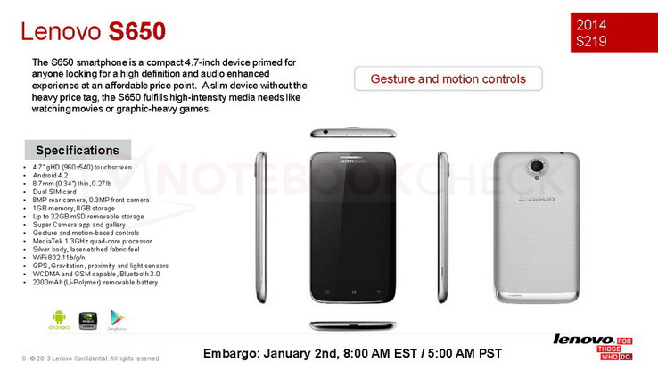 Die zweite Neuvorstellung in der S-Klasse von Lenovo ist das 126 Gramm schwere Smartphone S650. Wie das S930 nutzt auch das Lenovo S650 Phone als zentralen Chipsatz den Quadcore MediaTek MT6582 (1,3 GHz) sowie 1 GByte Hauptspeicher und 8 GByte Systemmemory. Das 4,7 Zoll große qHD-Display hat eine native Auflösung von 960 x 540 Pixeln. Die übrige Ausstattung des S650 entspricht ansonsten weitgehend dem großen Bruder S930. Vorne hat Lenovo allerdings lediglich eine 0,3-MP-Cam eingebaut. Für den Li-Polymer-Akku des S650 nennt Lenovo eine Kapazität von 2.000 mAh.