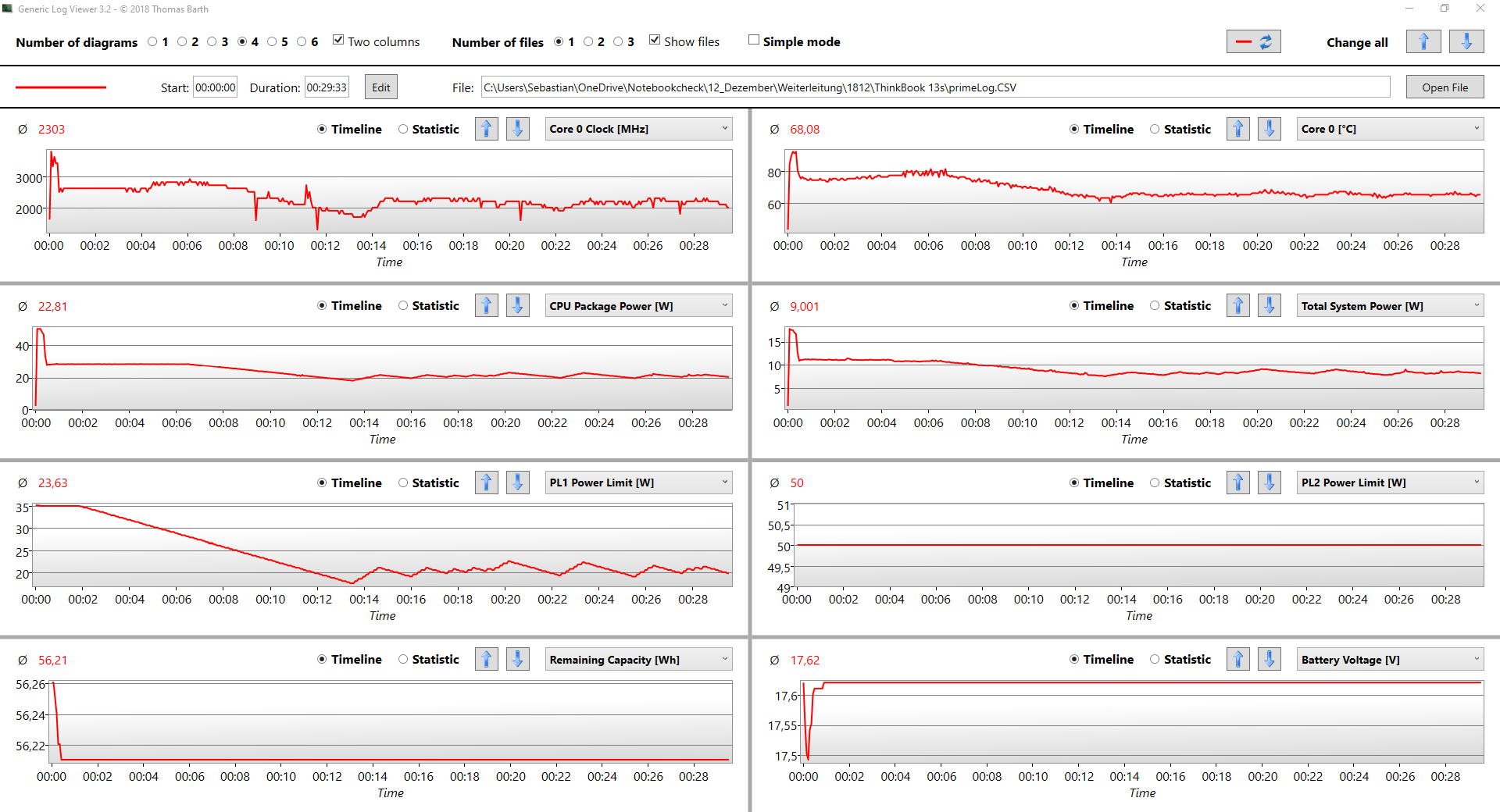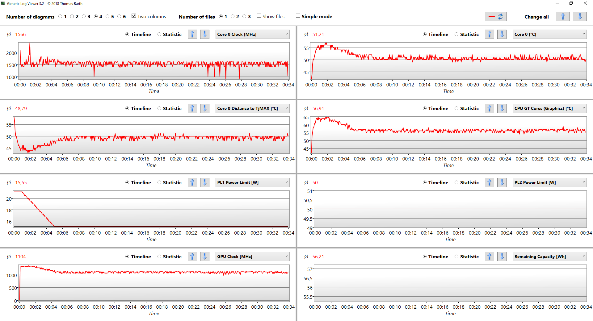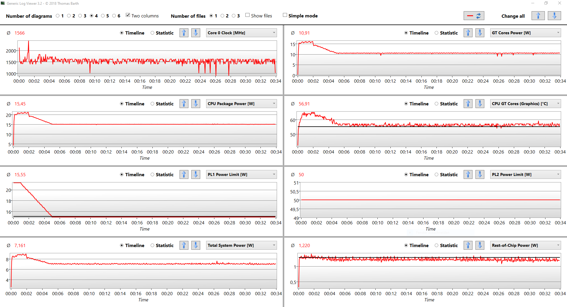 Prima ist der CPU-Stresstest: Beim Start darf sich der Chip ganz kurz 50 Watt gönnen (PL2), wozu auch Batteriespannung genutzt wird. Der PL1 liegt zuerst bei 35 Watt, sinkt ab der zweiten Minute aber bis auf um die 20 Watt. Die Batterie wird nur in den ersten Sekunden zur Hilfe herangezogen. Während der Aktion fällt der Takt von anfänglich 3,5 GHz auf 2,6 GHz, um im weiteren Verlauf knapp über 2,0 GHz zu verbleiben. Die Temperatur erreicht zu Begin fast 100 Grad, normalisiert sich im Verlauf dann auf 65 Grad.