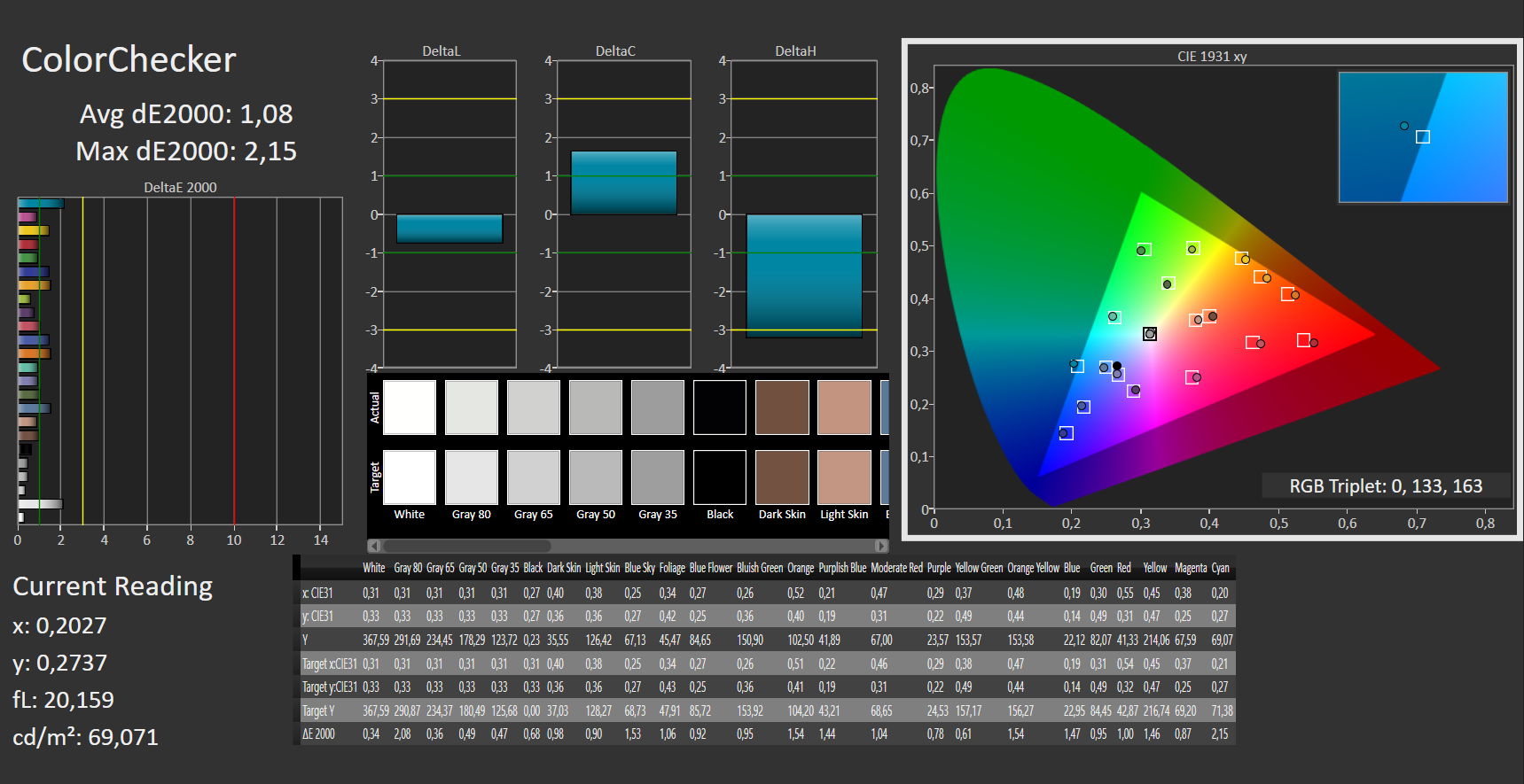 | Delta E Colorchecker * | 2.02 | 5.8 -187% | 3.41 -69% | 2.3 -14% | 4.35 -115% | 3.49 -73% |
