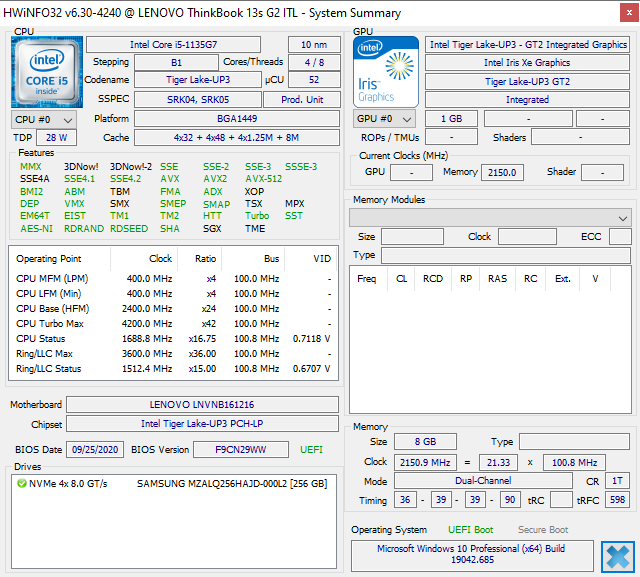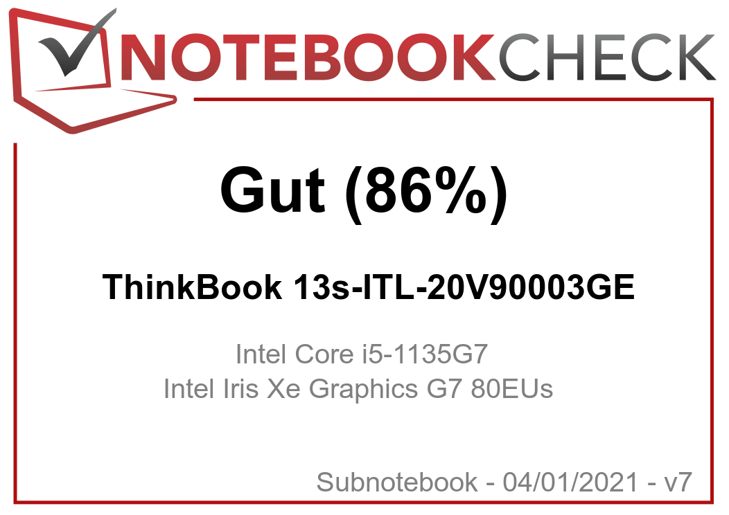 | 86 % v7 (old) | 01 / 2021 | Lenovo ThinkBook 13s-ITL-20V90003GE i5-1135G7, Iris Xe G7 80EUs | 1.3 kg | 14.9 mm | 13.30" | 1920x1080 | |