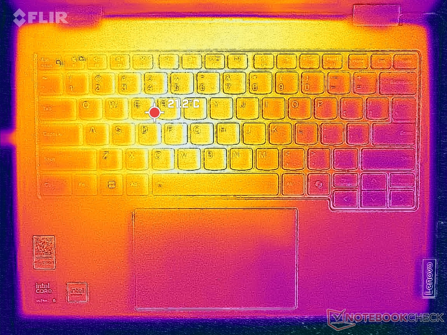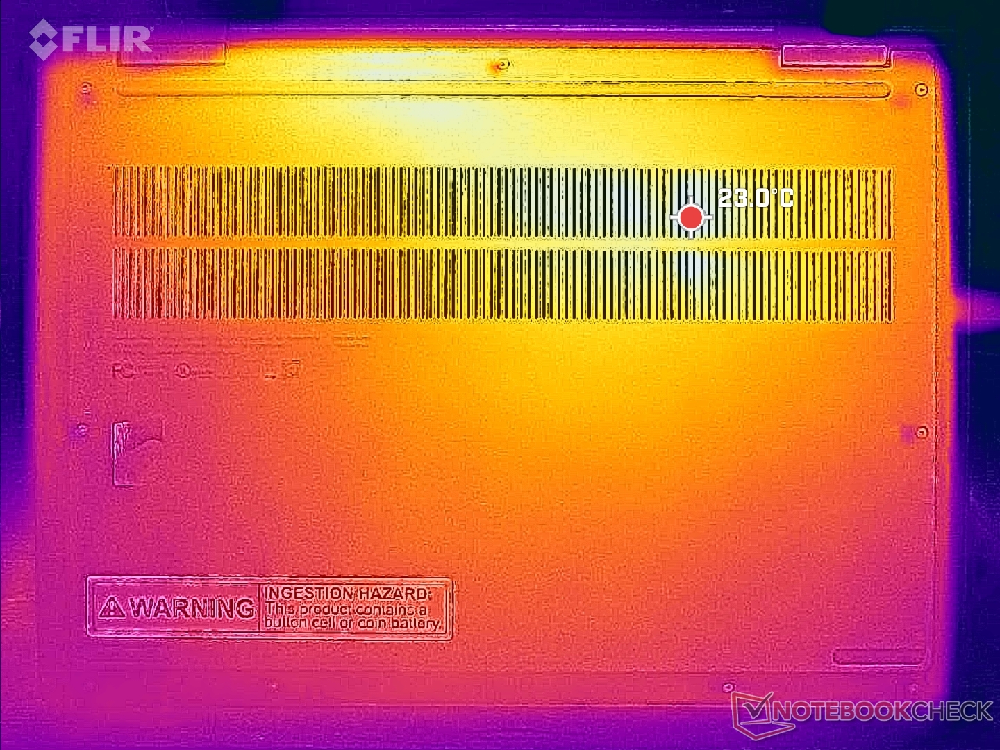 Die Oberflächentemperaturen sind aufgrund der asymmetrischen Kühllösung auf der linken Hälfte des Gehäuses wärmer als auf der rechten. Heiße Stellen auf der Tastatur und der Unterseite können 37 °C bzw. 39 °C erreichen. Das ist kühler als beim VivoBook Flip 14 und Aspire 5 Spin 14, wo die heißen Stellen jeweils über 40 °C erreichen und im Durchschnitt wärmer sind.