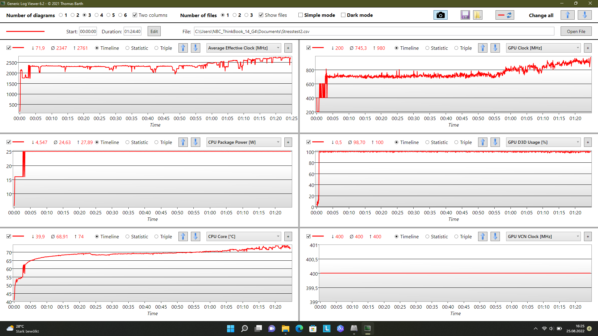 Im Stresstest kann das ThinkBook 14 G4 seine Leistung durchgängig halten. Prime95 und Furmark können den Laptop nicht zum Überhitzen bringen. Der AMD Ryzen 5 5625U wird nicht heißer als 80 °C. Die Wärmeabfuhr des Büro-Laptops funktioniert problemfrei.