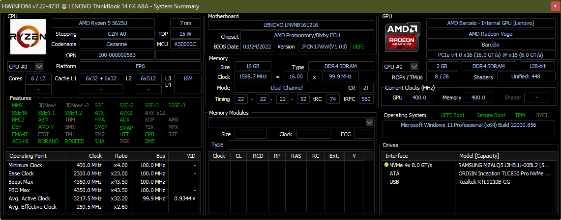 | Lenovo ThinkBook 14 G4 21DK0004GE Vega 7, R5 5625U, Samsung PM991a MZALQ512HBLU | Dell Inspiron 14 5425 6VPKR Vega 7, R5 5625U, SK Hynix BC711 512GB HFM512GD3GX013N | Acer TravelMate P4 TMP414-51-59MR Iris Xe G7 80EUs, i5-1135G7, SK hynix BC511 HFM256GDJTNI-82A0 | HP Pavilion 14-dv0357ng Iris Xe G7 80EUs, i5-1135G7, Intel Optane Memory H10 with Solid State Storage 32GB + 1TB HBRPEKNX0203AH(L/H) | Dynabook Tecra A40-J-12E Iris Xe G7 80EUs, i5-1135G7, Phison C-E80T512G4-P3D3B3E13 | Lenovo ThinkBook 15 G4 21DL0009GE Vega 7, R5 5625U, Samsung PM991a MZALQ512HBLU | Schenker Work 15 Tiger Lake-H Iris Xe G7 96EUs, i7-11370H, Samsung SSD 980 Pro 1TB MZ-V8P1T0BW | |