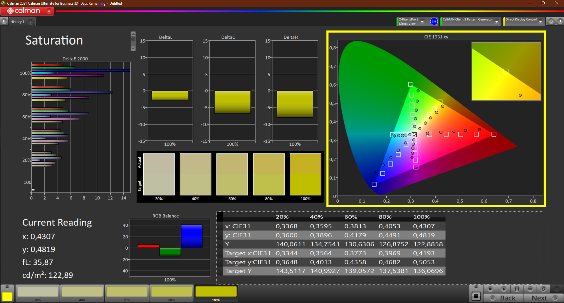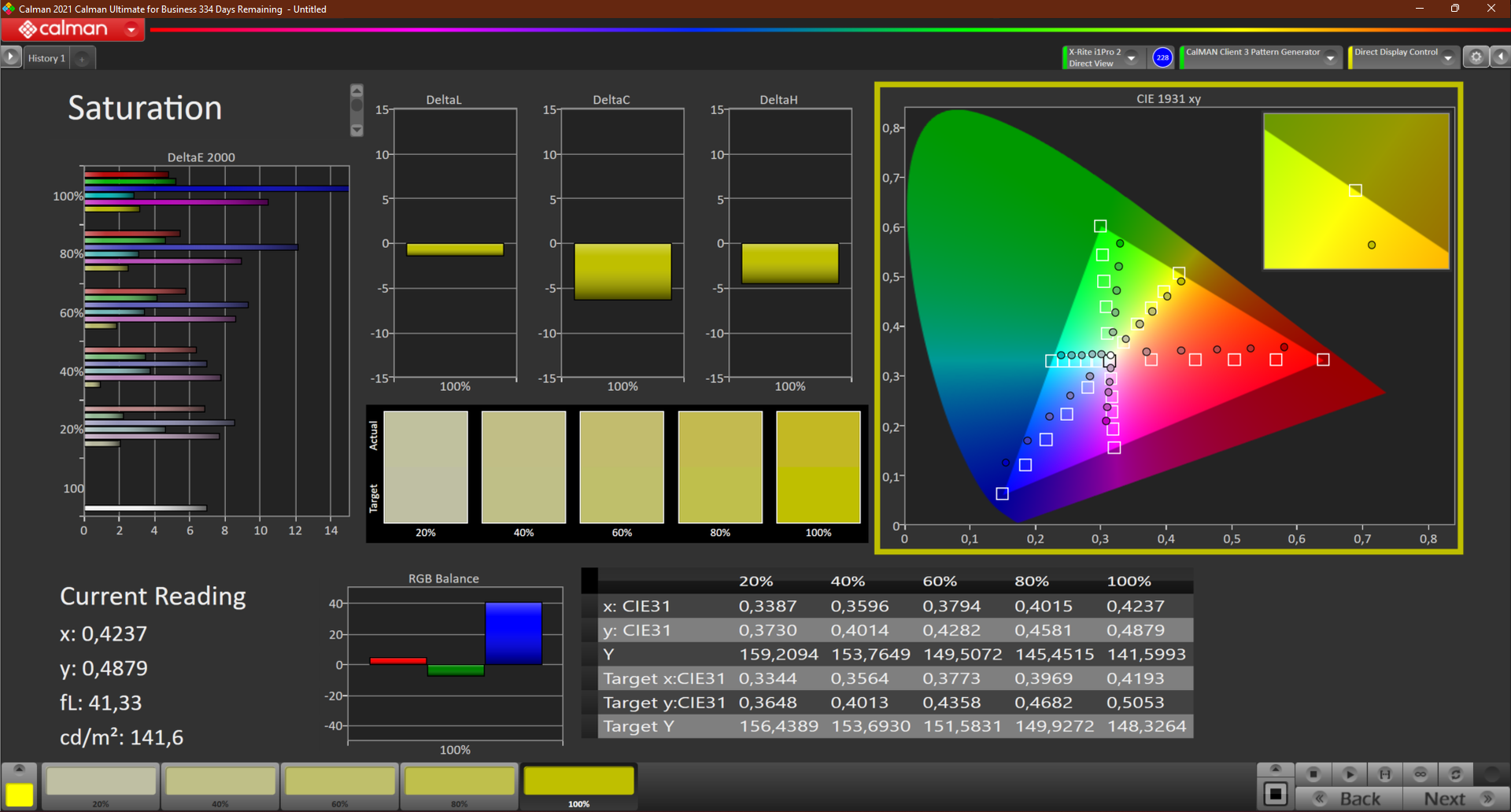 Calman ColorChecker ermittelt bei den Farbabweichungen recht hohe Werte. Die geringe Farbraumabdeckung schlägt sich hier primär in den maximal gemessenen Werten nieder. So stimmen die Vollfarben Rot, Blau und Grün nicht mit den Vorgaben überein. Die Kalibrierungsdatei aus der Info-Box liefert hier nur eine geringe Verbesserung der durchschnittlichen Farbabweichung auf ein deltaE von 4,5.