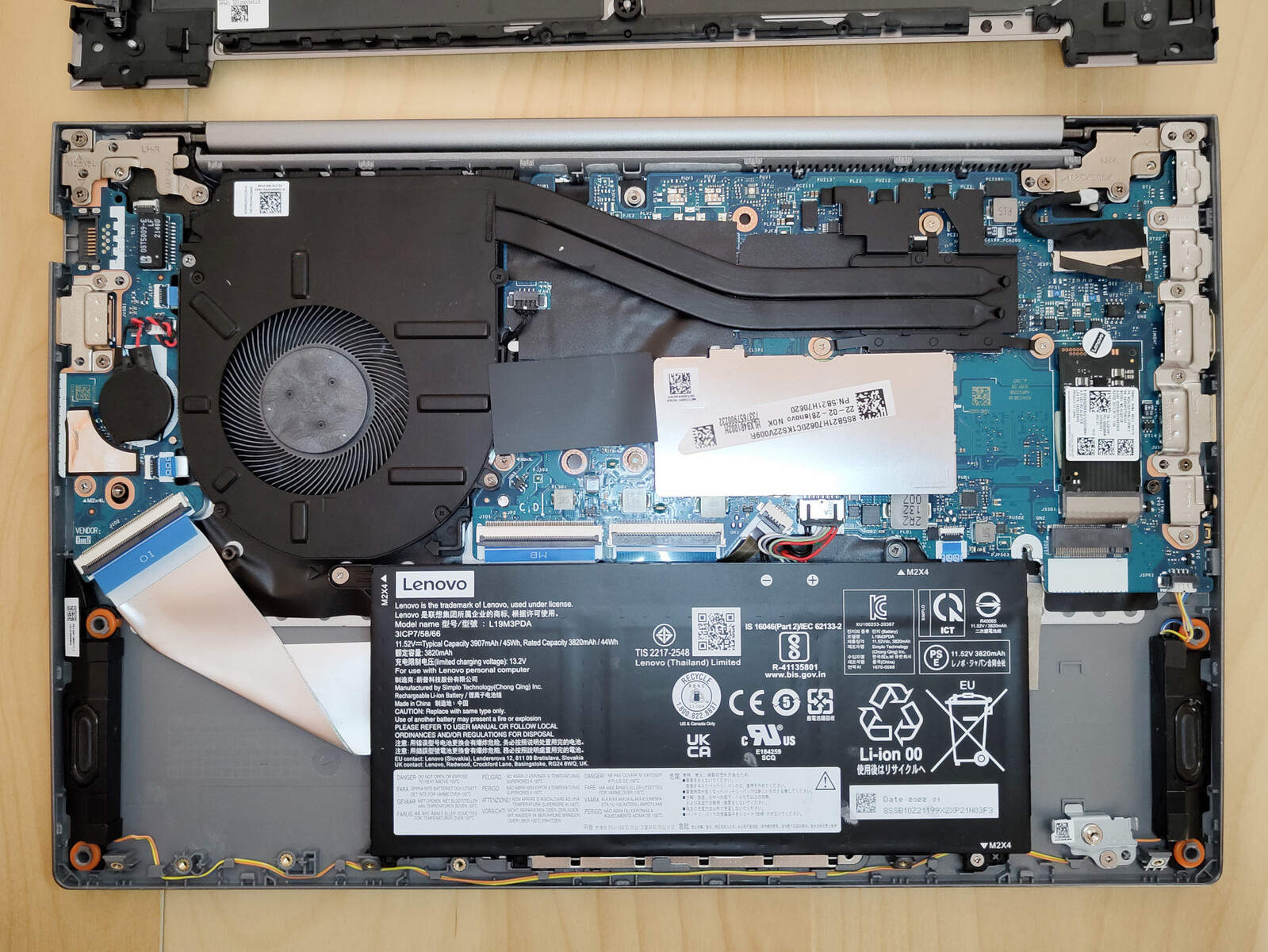 Die Basis des Notebooks lässt sich schnell entfernen. Darunter finden sich einige Upgrade-Möglichkeiten. Ein freier M.2-Slot steht hier zur Verfügung. Sonst lassen sich der vorhandene Arbeitsspeicherriegel und die NVMe-SSD austauschen. Beinahe alle Bauteile sind auch genau so im ThinkBook 15 G4 verbaut.