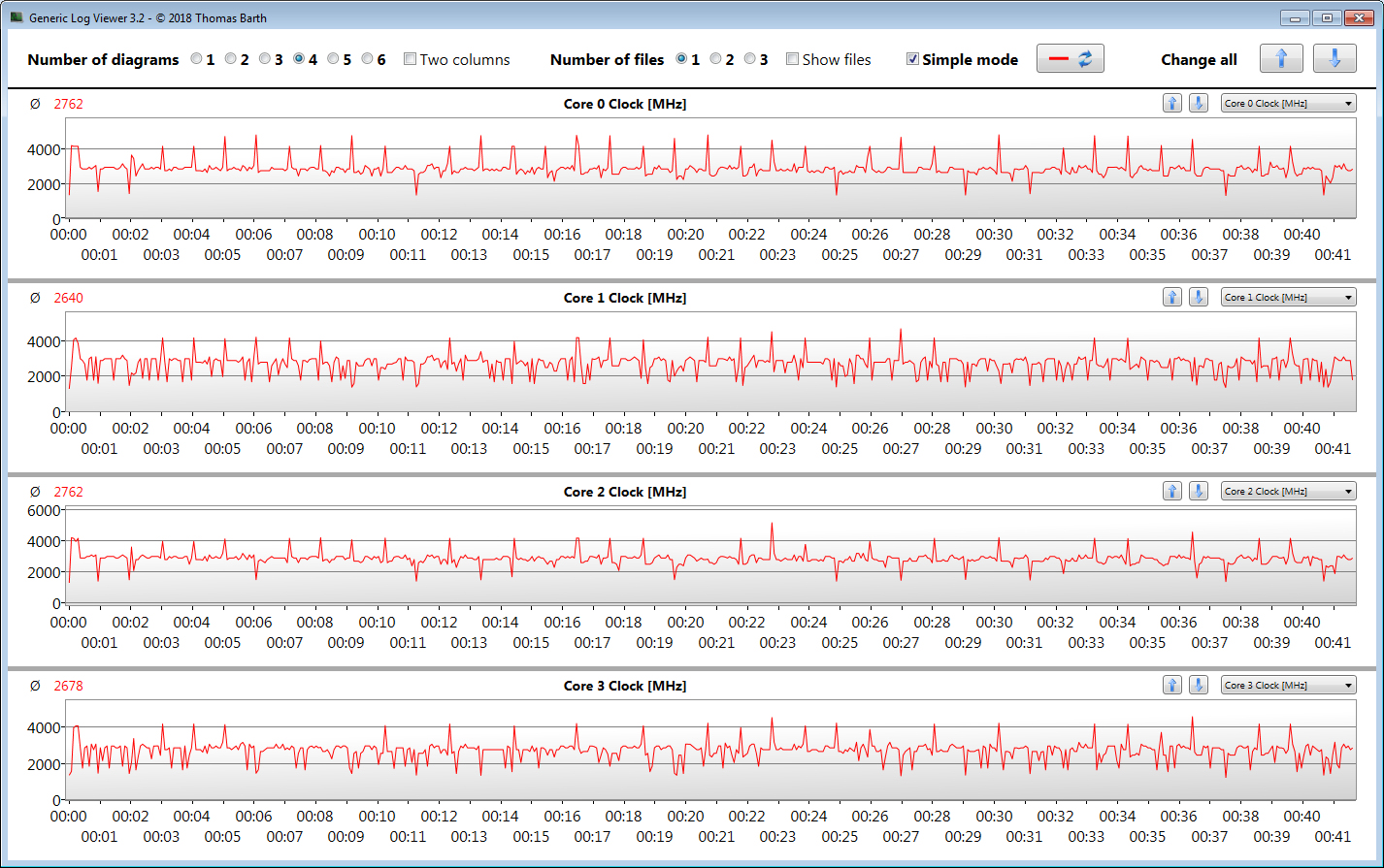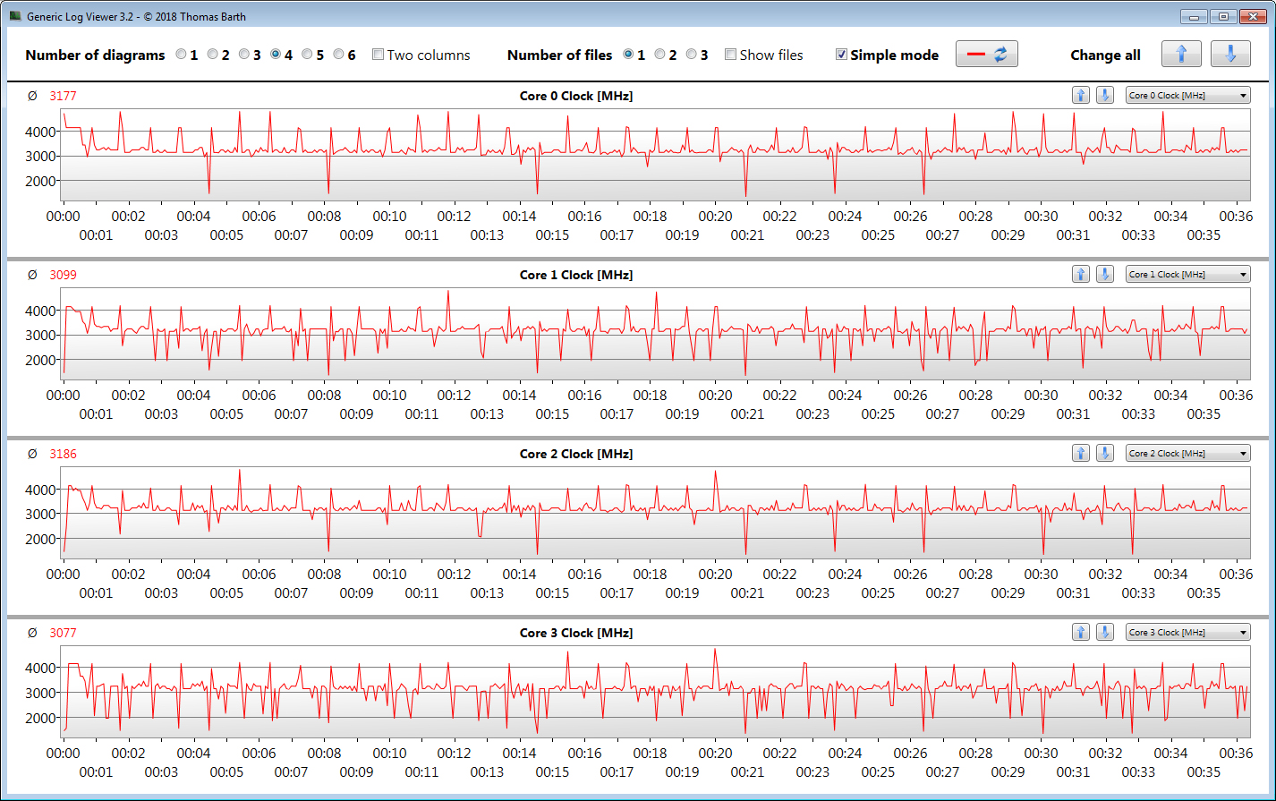 Unseren Stresstest (Prime95 und Furmark laufen für mindestens eine Stunde) durchlaufen CPU bzw. GPU größtenteils mit 600 bis 1.100 MHz bzw. 550 bis 650 MHz. Nur in den ersten Sekunden des Tests werden mit 2,8 GHz (CPU) bzw. 1,3 GHz (GPU) höhere Geschwindigkeiten erreicht. Der Stresstest stellt ein Extremszenario dar. Wir überprüfen mit diesem Test, ob das System auch bei voller Auslastung stabil läuft.