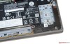 Der Rechner bringt zwei USB-A-Anschlüsse (USB 3.2 Gen 1) und zwei USB-C-Steckplätze (USB 3.2 Gen 2; Power Delivery, Displayport per USB-C) mit. In der Summe hält das Notebook drei Videoausgänge (2x DP, 1x HDMI) bereit. Der SD-Speicherkartenleser (Referenzkarte: AV PRO SD 128 GB V60) gehört zu den mittelschnellen Modellen.