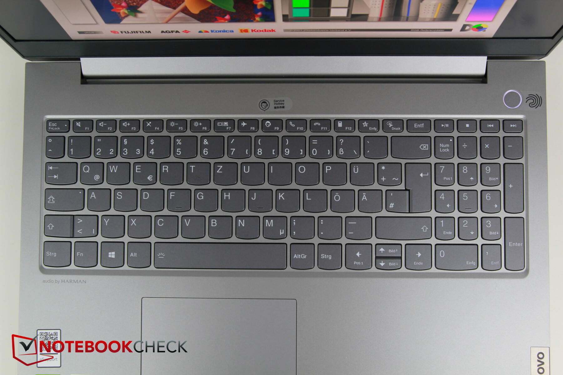 Lenovo verbaut eine Chiclet-Tastatur mit einer weißen, zweistufigen Hintergrundbeleuchtung. Ein schmaler Ziffernblock passt auch noch daneben, der An-Schalter ist separat und liegt rechts oberhalb der übrigen Tasten.
